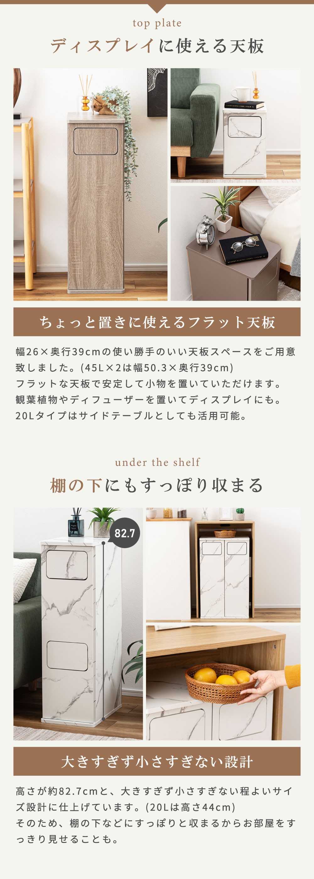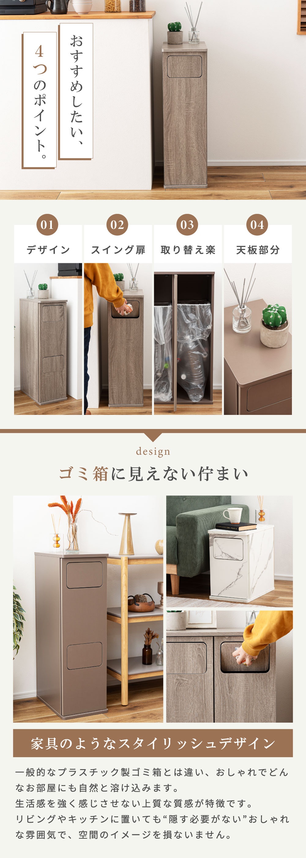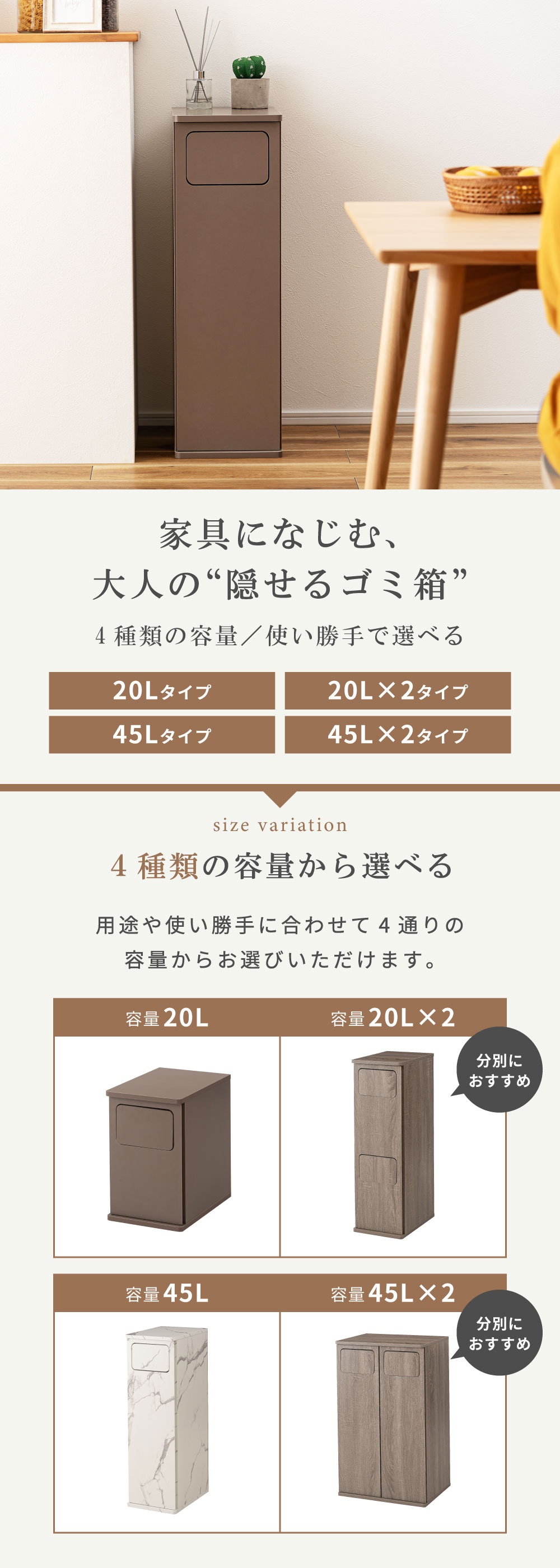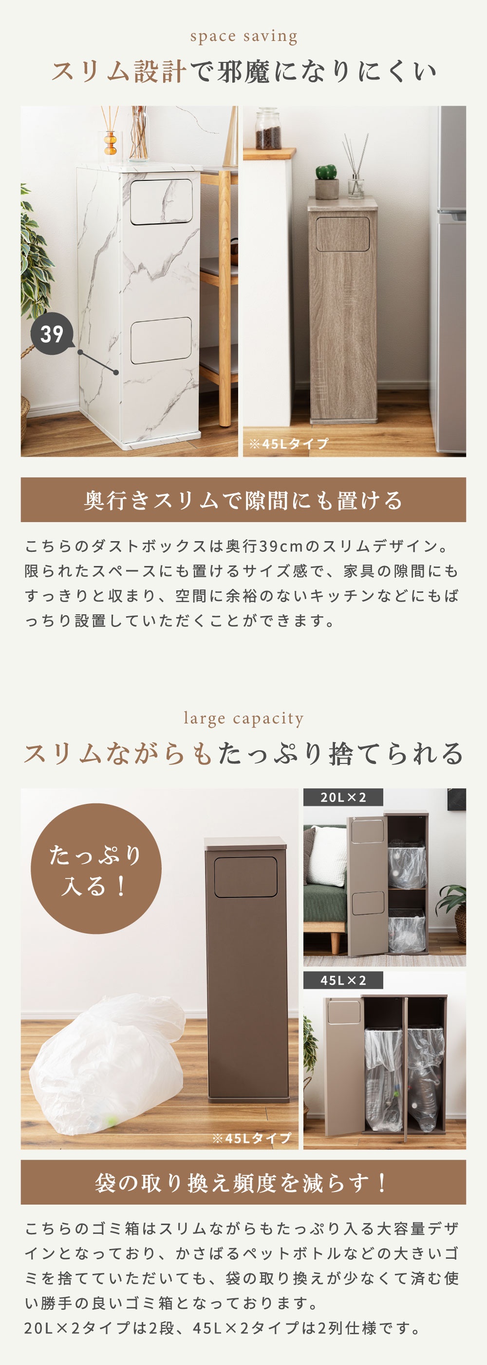| ポイント | まるでインテリア家具のようなスタイリッシュなデザイン。 生活感が出がちなゴミ箱を、空間に自然と溶け込む“見せたくなるアイテム”へ。 本体は木目調の化粧繊維板を使用し、どんなお部屋にも馴染む落ち着いた雰囲気に仕上げました。 扉はマグネット式で開閉がスムーズ。内部には“袋止めリング”を搭載しているため、ゴミ袋が外から見えず、美しい見た目を保ったまましっかり固定できます。 サイズも単体から2連タイプまで幅広く展開。 キッチン、リビング、洗面所、寝室など、置きたい空間に合わせてお選びいただけます。 見た目も使いやすさも妥協しない方へ。 あなたの暮らしを、もっと美しく。 ■ 見せたくなるデザイン 家具のような存在感の木目調デザインで、どんなお部屋にも自然に馴染みます。 一般的なプラスチック製ゴミ箱とは違い、生活感を強く感じさせない上質な質感が特徴。 リビングやキッチンに置いても“隠す必要がない”おしゃれな雰囲気で、空間のイメージを損ないません。 インテリア重視の方や、部屋づくりにこだわりたい方にも自信を持っておすすめできる一台です。 ■ 使いやすいマグネット扉 前面扉はマグネット式でスムーズに開閉できます。 力を入れなくても扱えるため、調理中や片手がふさがっているときでも楽に使えるのが嬉しいポイント。 頻繁に使う場所こそ、ストレスのない構造が大切。毎日触れるたびに使いやすさを実感できます。 ■ 袋止めリングで“見た目スッキリ” 内部には“袋止めリング”を搭載しており、ゴミ袋が固定され、外から見える心配がありません。 袋がはみ出すことによる生活感を徹底的にカバーし、美しい見た目をキープ。 また、リングは取り外ししやすく、ゴミ袋の交換も迷うことなくスムーズに行えます。 ■ 選べる容量&組み合わせ 用途や置き場所に合わせて選べる豊富なサイズ展開が魅力です。 20L(単体) コンパクトサイズで省スペース。キッチン横や洗面所にも置きやすい高さ。 20L×2(2連タイプ) 縦長スリム設計で、分別しながら場所を取らないのが魅力。限られたスペースにも最適。 45L(単体) 大容量でもスリムな奥行きで、壁に沿わせやすく圧迫感を与えません。 45L×2(ワイド2連タイプ) ファミリー世帯に最適な2分別の大容量モデル。分別しながら収納性も確保します。 ■ お部屋に馴染むサイズ感と実用性 幅はスリム、奥行きは39cmで狭いスペースにも置きやすいバランス。 天板はフラットで小物などを置きやすく、ディフューザーや観葉植物を飾ってインテリアとして楽しむこともできます。 |