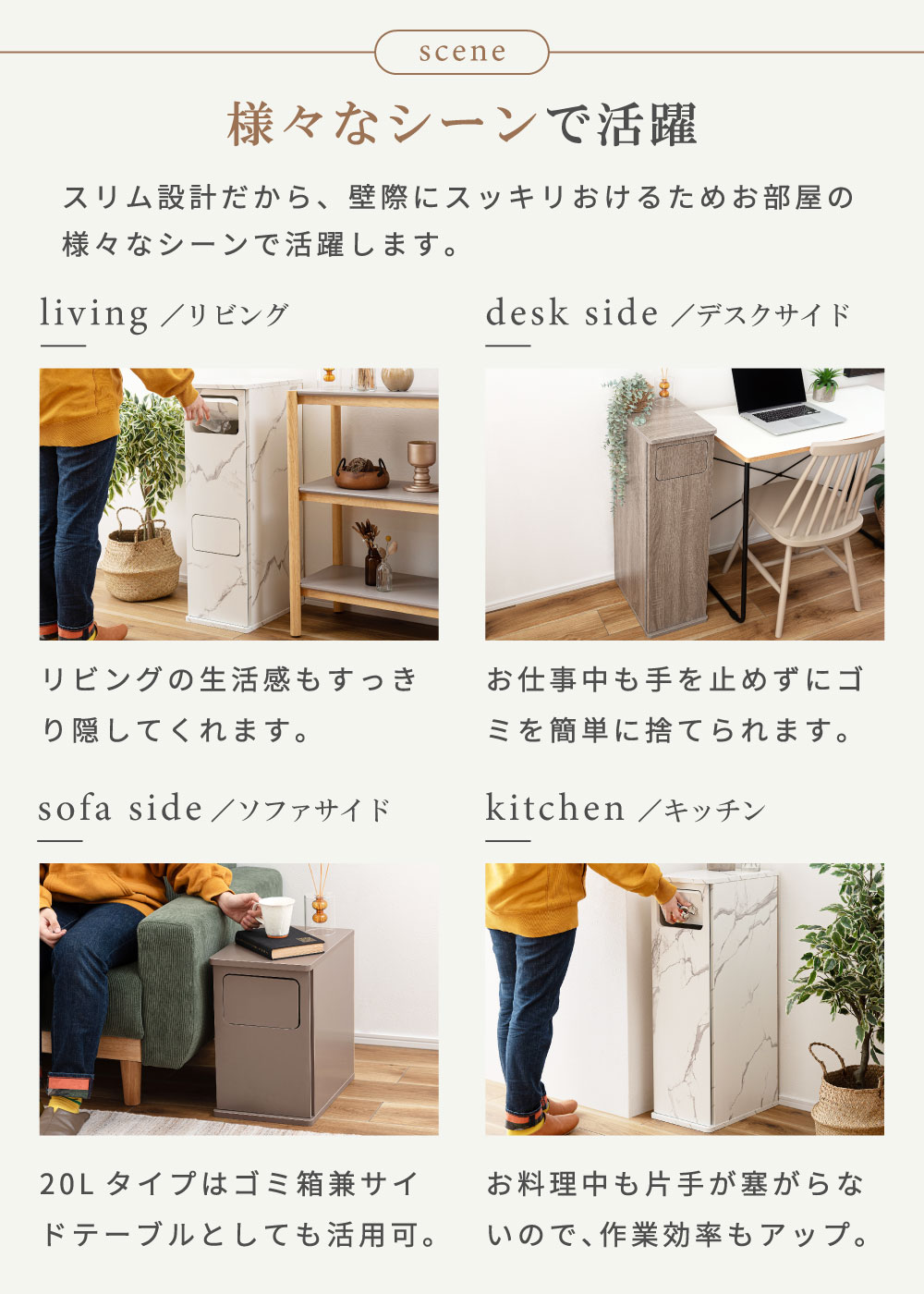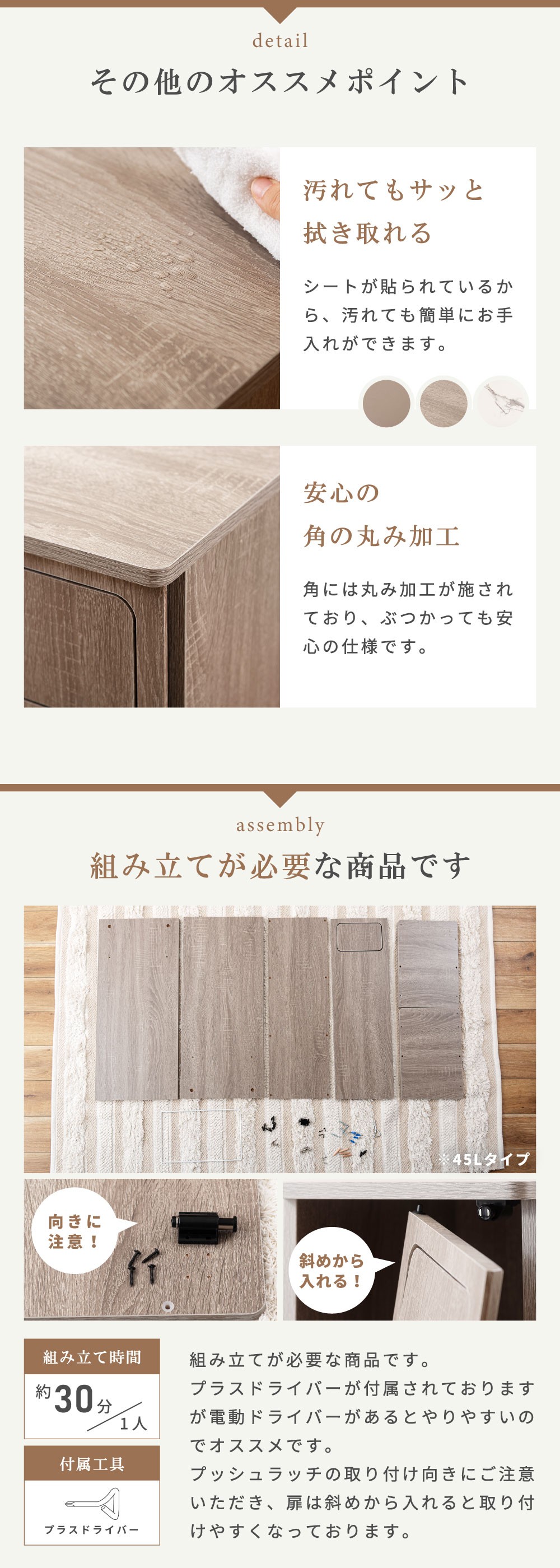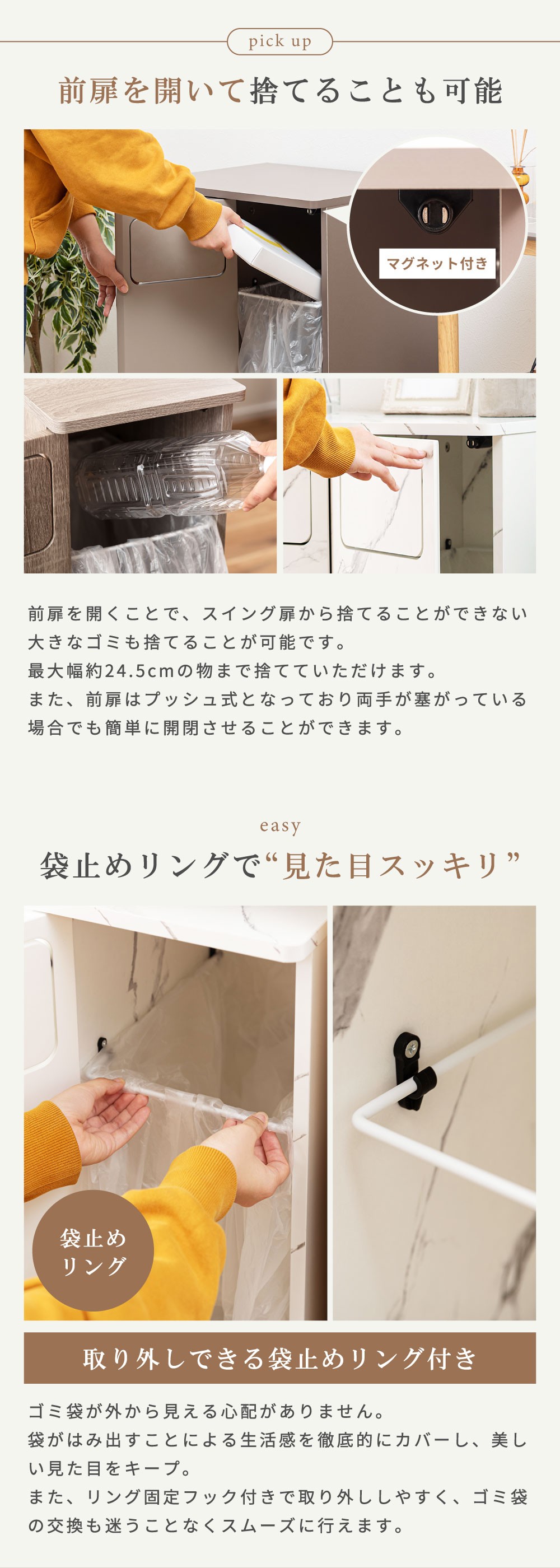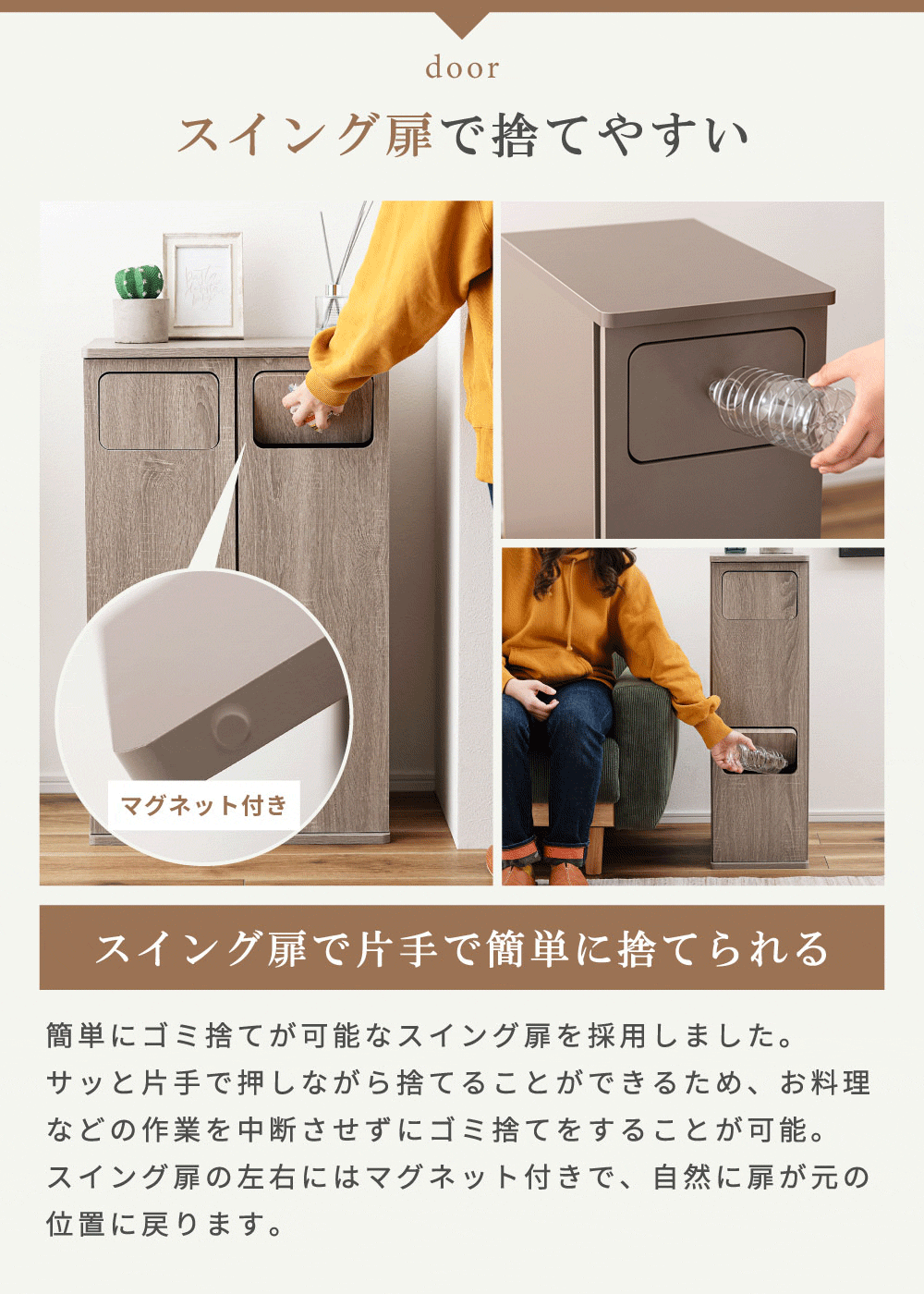 | ポイント | まるでインテリア家具のようなスタイリッシュなデザイン。 生活感が出がちなゴミ箱を、空間に自然と溶け込む“見せたくなるアイテム”へ。 本体は木目調の化粧繊維板を使用し、どんなお部屋にも馴染む落ち着いた雰囲気に仕上げました。 扉はマグネット式で開閉がスムーズ。内部には“袋止めリング”を搭載しているため、ゴミ袋が外から見えず、美しい見た目を保ったまましっかり固定できます。 サイズも単体から2連タイプまで幅広く展開。 キッチン、リビング、洗面所、寝室など、置きたい空間に合わせてお選びいただけます。 見た目も使いやすさも妥協しない方へ。 あなたの暮らしを、もっと美しく。 ■ 見せたくなるデザイン 家具のような存在感の木目調デザインで、どんなお部屋にも自然に馴染みます。 一般的なプラスチック製ゴミ箱とは違い、生活感を強く感じさせない上質な質感が特徴。 リビングやキッチンに置いても“隠す必要がない”おしゃれな雰囲気で、空間のイメージを損ないません。 インテリア重視の方や、部屋づくりにこだわりたい方にも自信を持っておすすめできる一台です。 ■ 使いやすいマグネット扉 前面扉はマグネット式でスムーズに開閉できます。 力を入れなくても扱えるため、調理中や片手がふさがっているときでも楽に使えるのが嬉しいポイント。 頻繁に使う場所こそ、ストレスのない構造が大切。毎日触れるたびに使いやすさを実感できます。 ■ 袋止めリングで“見た目スッキリ” 内部には“袋止めリング”を搭載しており、ゴミ袋が固定され、外から見える心配がありません。 袋がはみ出すことによる生活感を徹底的にカバーし、美しい見た目をキープ。 また、リングは取り外ししやすく、ゴミ袋の交換も迷うことなくスムーズに行えます。 ■ 選べる容量&組み合わせ 用途や置き場所に合わせて選べる豊富なサイズ展開が魅力です。 20L(単体) コンパクトサイズで省スペース。キッチン横や洗面所にも置きやすい高さ。 20L×2(2連タイプ) 縦長スリム設計で、分別しながら場所を取らないのが魅力。限られたスペースにも最適。 45L(単体) 大容量でもスリムな奥行きで、壁に沿わせやすく圧迫感を与えません。 45L×2(ワイド2連タイプ) ファミリー世帯に最適な2分別の大容量モデル。分別しながら収納性も確保します。 ■ お部屋に馴染むサイズ感と実用性 幅はスリム、奥行きは39cmで狭いスペースにも置きやすいバランス。 天板はフラットで小物などを置きやすく、ディフューザーや観葉植物を飾ってインテリアとして楽しむこともできます。 |