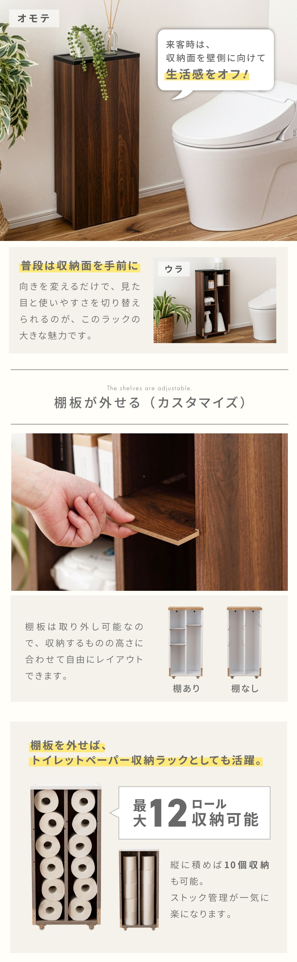 | ポイント | さっと向きを変えるだけで、 “見せない収納”と“使いやすい収納”を切り替えられる 「ちょうどいいサイズ感」「置きやすいデザイン」「頼れる収納力」 この3つを兼ね備えた、トイレのための収納ラックです。 ●スリムで省スペース トイレのすき間や壁際にすっきり収まるスリム設計。 圧迫感がなく、限られたスペースでも無理なく設置できます。 ●区切られた収納が活躍 内部は5つの収納スペースに分かれた設計。 ●隠せる収納 来客時は、収納面を壁側に向けて生活感をオフ。 普段使いは、収納面を手前に向けて使いやすく。 向きを変えるだけで、見た目と使いやすさを切り替えられるのが、このラックの大きな魅力です。 ●棚板が外せる(カスタマイズ) 棚板は取り外し可能なので、 収納するものの高さに合わせて自由にレイアウトできます。 「この段だけ高くしたい」 「背の高いボトルを入れたい」 そんな調整もかんたん。 |