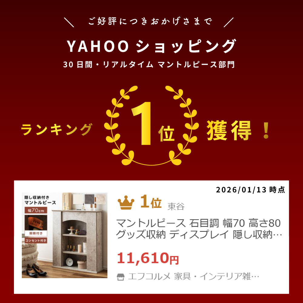 | ポイント | ”カワイイ”を諦めない、大人のためのマントルピース。 ●シンプル可愛いデザイン シンプルで主張しすぎないデザインは、ナチュラルから韓国風まで幅広いテイストにマッチ◎ お部屋に馴染みつつワンランク上の雰囲気を演出します。 ●つい眺めたくなるアーチ型 収納部分上は、暖炉を思い浮かべるアーチ型になっています。 直線的なデザインの中に丸みが加わることで、ほんのりガーリーな印象を与えます。 ●置きやすいスリムサイズ 幅70×奥行22cmとスリムなサイズ感で、圧迫感を感じにくいためワンルームなどの限られた空間にもオススメ。 壁と家具、家具と家具などのちょっとしたスペースにもピッタリです。 ●両サイドの隠し収納 両サイドには、生活感のある小物などを収納できる隠し収納付き。 軽く押すだけで開くプッシュ扉式で、取っ手のないスマートな仕上がりです。 ●棚は3.2cm間隔・3段階で高さ調節可能 ●天板裏にはライト付き 天板裏にはLEDライトが付いており、1番上の棚に置いたアイテムを優しく照らしてくれます。 ●便利な1口コンセント |