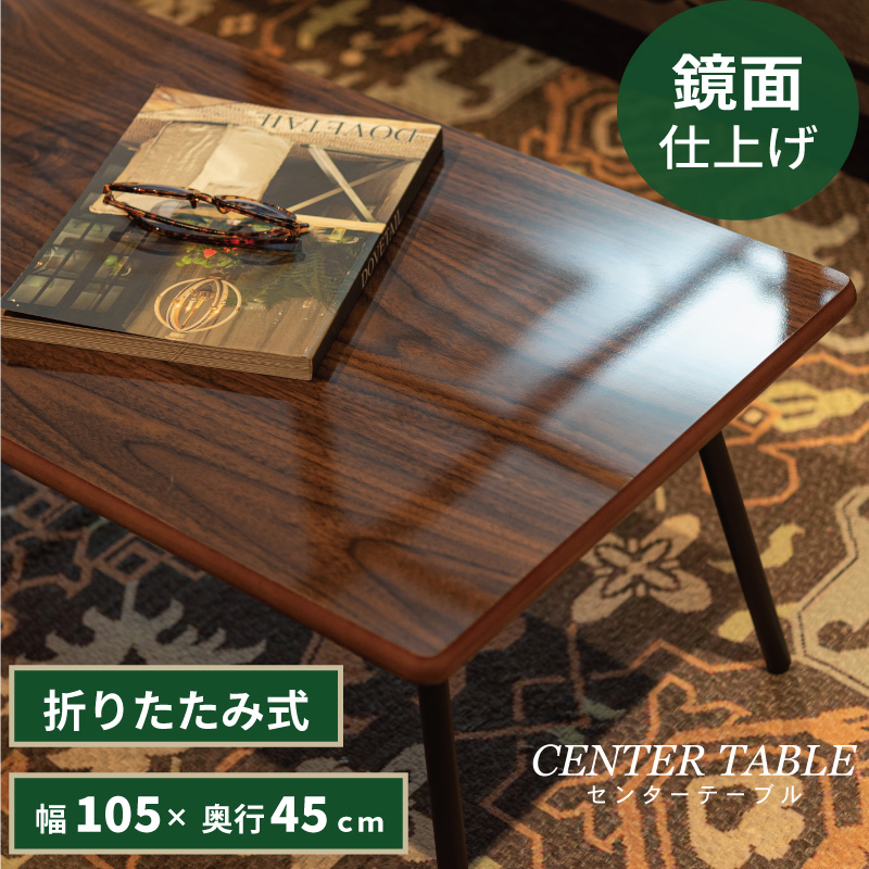 センターテーブル 幅105cm フォールディングテーブル おしゃれ シンプル テーブル 折りたたみ コンパクト 簡易テーブル ブラウン 鏡面 ローテーブル 幅105cm 木目調 黒 スチール 脚 モダン インダストリアル ブラウン シンプル