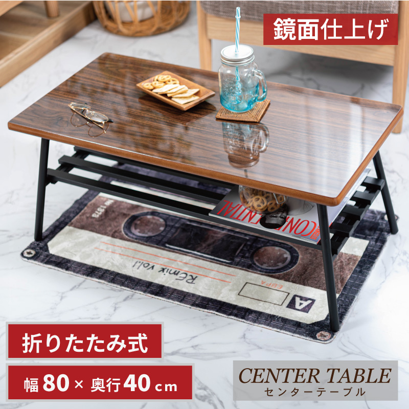 センターテーブル 幅80cm フォールディングテーブル おしゃれ シンプル テーブル 折りたたみ コンパクト 簡易テーブル ブラウン 鏡面 ローテーブル 棚付き 収納棚 木目調 黒 スチール 脚 モダン インダストリアル ブラウン シンプル