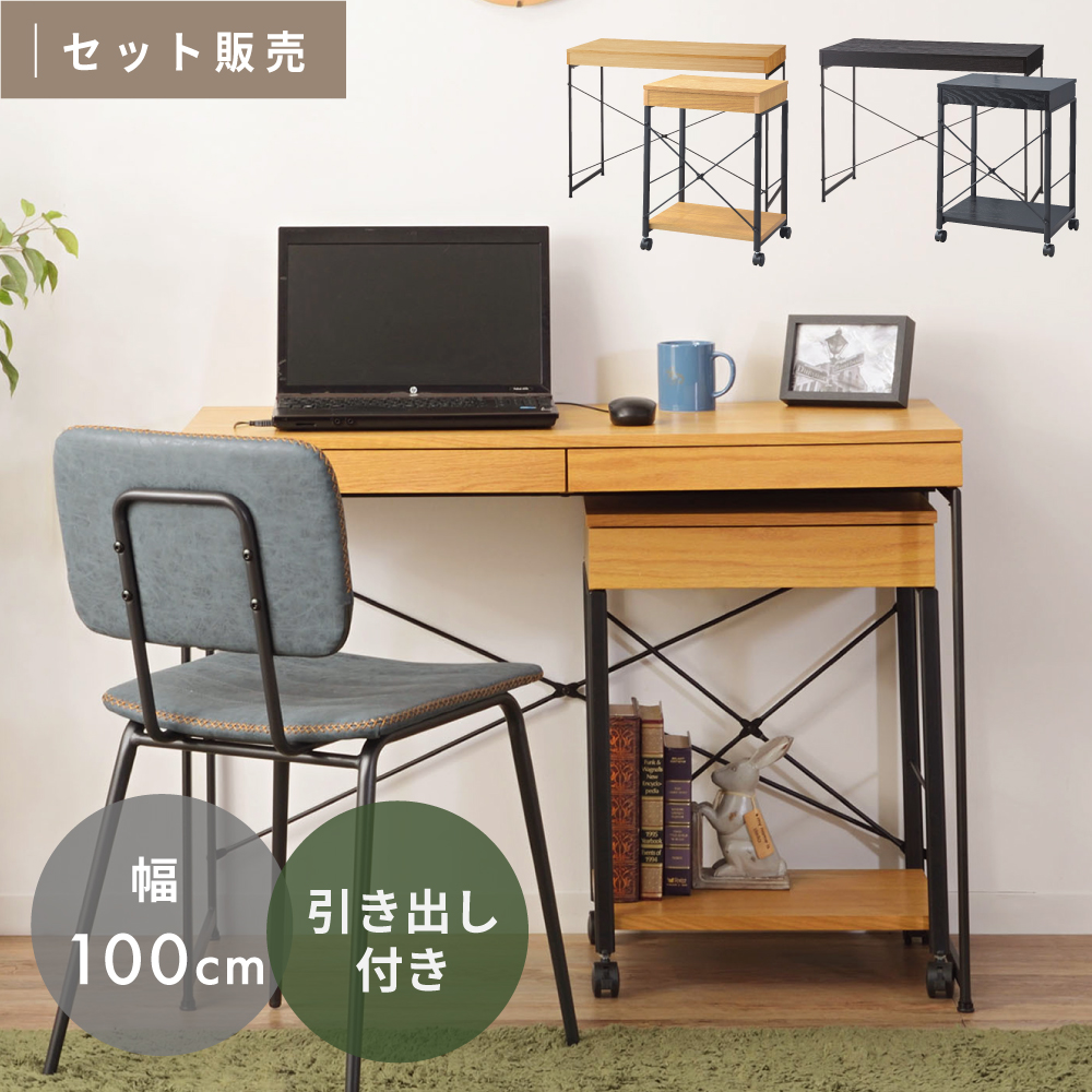 デスクセット デスク ワゴン デスクワゴン 引き出し パソコンデスク 木製 天然木 アジャスター PCデスク シンプル おしゃれ 北欧 インダストリアル スリム モダン コンパクト モダン スタイリッシュ スチール 黒 ブラック 在宅勤務 リモートワーク 大人 勉強机
