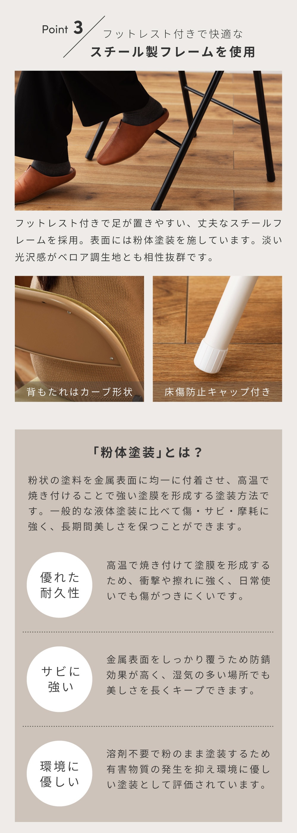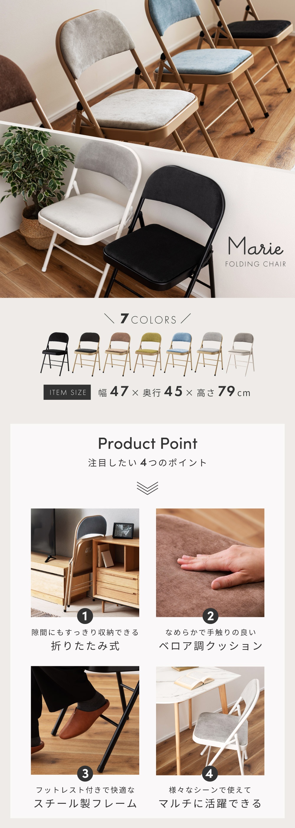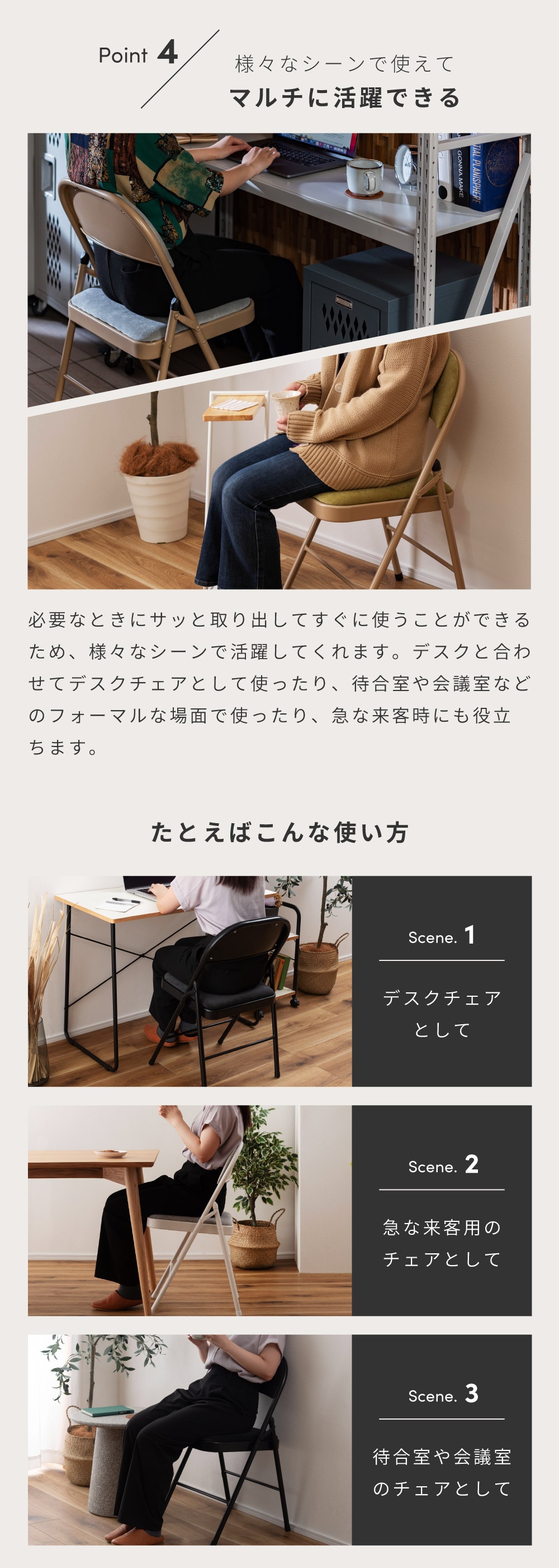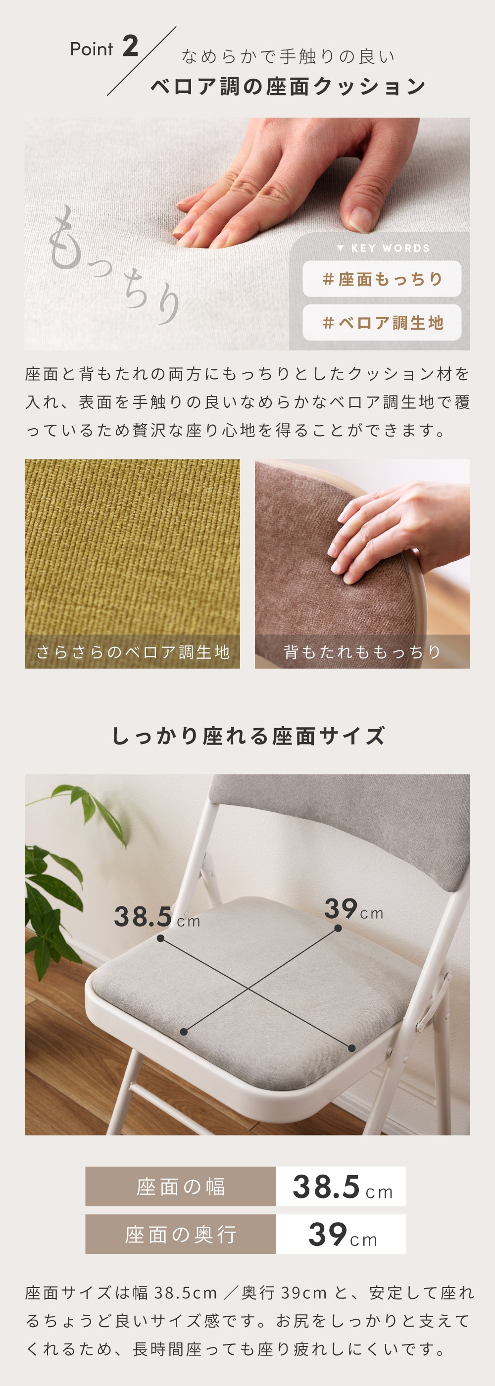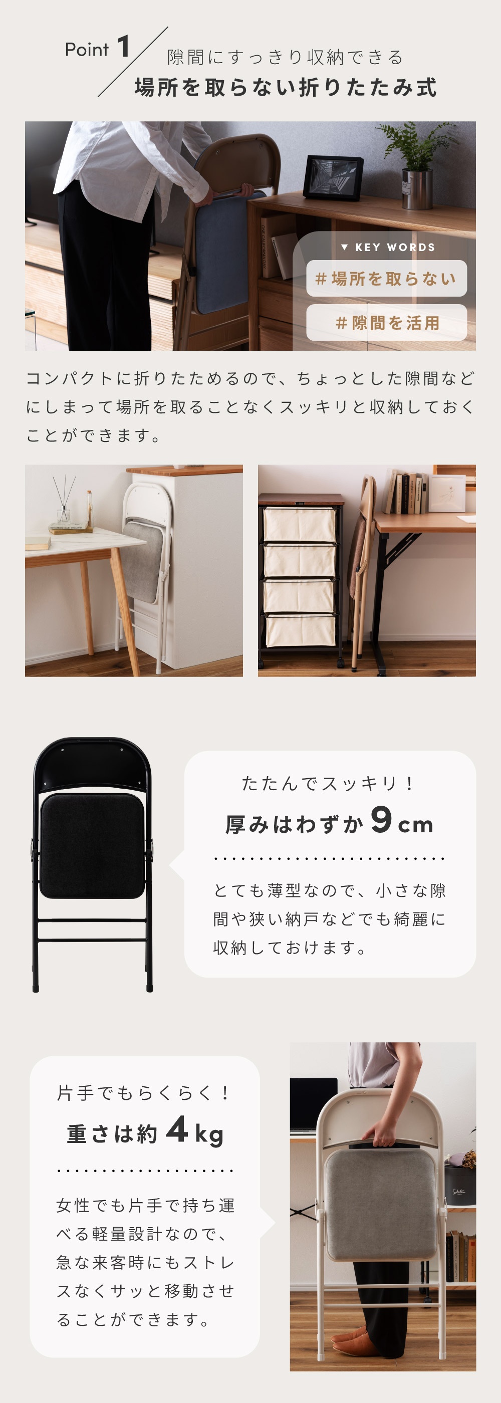 | ポイント | ●隙間にすっきり収納できる、場所を取らない折りたたみ式。 コンパクトに折りたためるので、ちょっとした隙間などにしまって場所を取ることなくスッキリと収納しておくことができます。 ●たたんでスッキリ!厚みはわずか9cm とても薄型なので、小さな隙間や狭い納戸などでも綺麗に収納しておけます。 ●片手でもらくらく!重さは約4kg 女性でも片手で持ち運べる軽量設計なので、急な来客時にもストレスなくサッと移動させることができます。 ●なめらかで手触りの良いベロア調の座面クッション 座面と背もたれの両方にもっちりとしたクッション材を入れ、表面を手触りの良いなめらかなベロア調生地で覆っているため贅沢な座り心地を得ることができます。 ●しっかり座れる座面サイズ 座面サイズは幅38.5cm/奥行39cmと、安定して座れるちょうど良いサイズ感です。 お尻をしっかりと支えてくれるため、長時間座っても座り疲れしにくいです。 ●フットレスト付きで快適なスチール製フレームを使用 フットレスト付きで足が置きやすい、丈夫なスチールフレームを採用。 表面には粉体塗装を施しています。 淡い光沢感がベロア調生地とも相性抜群です。 ●「粉体塗装」とは? 粉状の塗料を金属表面に均一に付着させ、高温で焼き付けることで強い塗膜を形成する塗装方法です。 一般的な液体塗装に比べて傷・サビ・摩耗に強く、長期間美しさを保つことができます。 ・優れた耐久性 高温で焼き付けて塗膜を形成するため、衝撃や擦れに強く、日常使いでも傷がつきにくいです。 ・サビに強い 金属表面をしっかり覆うため防錆効果が高く、湿気の多い場所でも美しさを長くキープできます。 ・環境に優しい 溶剤不要で粉のまま塗装するため有害物質の発生を抑え環境に優しい塗装として評価されています。 ●様々なシーンで使えてマルチに活躍できる 必要なときにサッと取り出してすぐに使うことができるため、様々なシーンで活躍してくれます。 デスクと合わせてデスクチェアとして使ったり、待合室や会議室などのフォーマルな場面で使ったり、急な来客時にも役立ちます。 ●たとえばこんな使い方 ・デスクチェアとして ・急な来客用のチェアとして ・待合室や会議室のチェアとして |