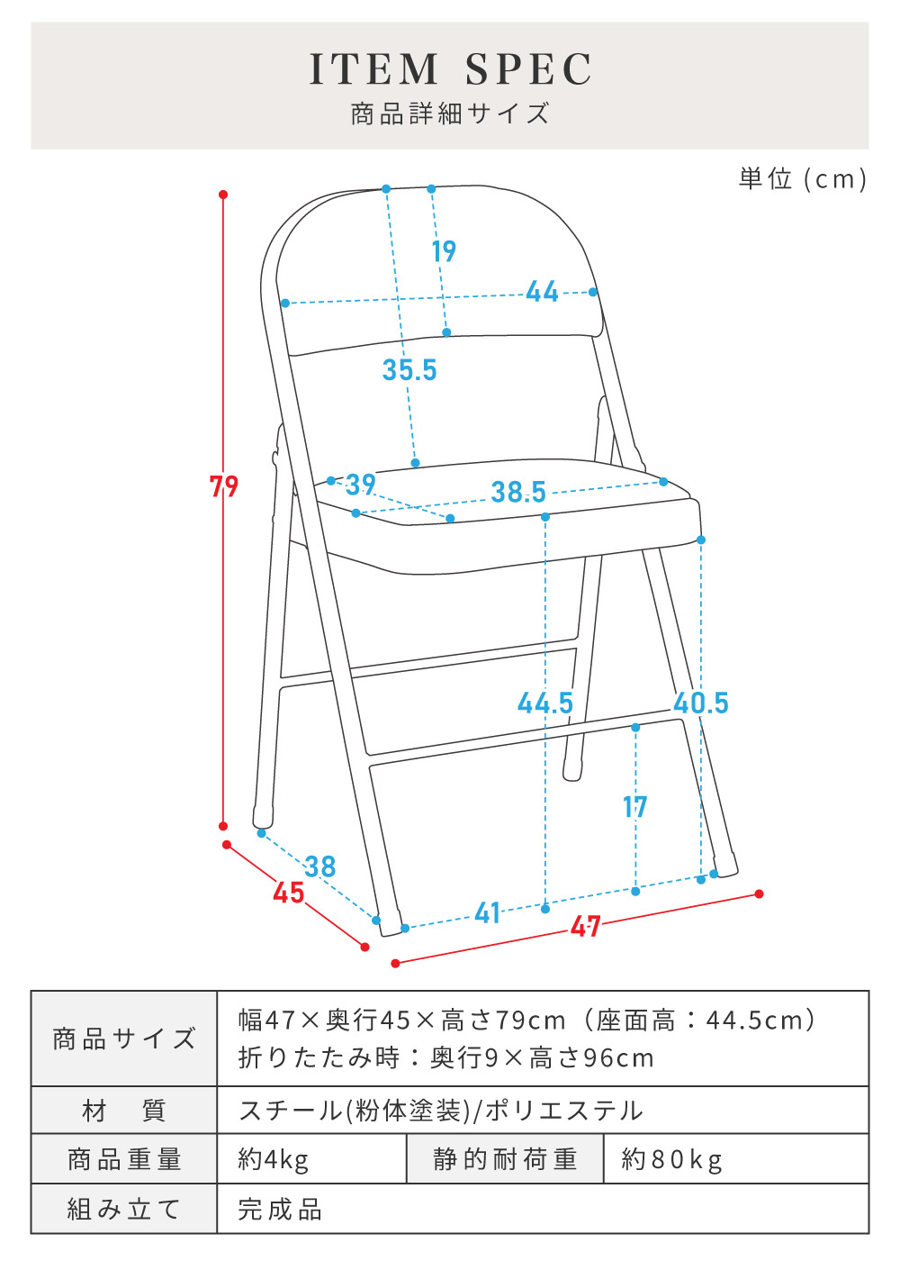 | サイズ | 幅47×奥行45×高さ79cm 座面までの高さ:44.5cm 折りたたみ時:幅47×奥行9×高さ96cm 【詳しいサイズ図はコチラ】 |