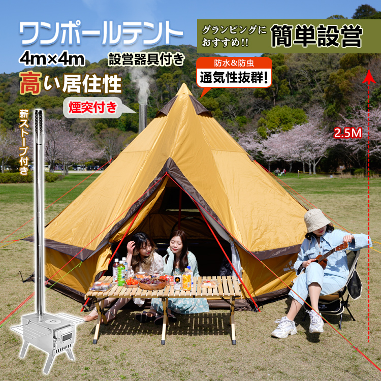 | 種類・サイズ | ●サイズ ・テント本体シート:400cm×400 cm×250 cm ・支柱ポール×1:直径3.2cm×250cm ・エントランスポール×2:直径1.6cm×173cm ・ペグ×16:直径1cm×1.8cm |