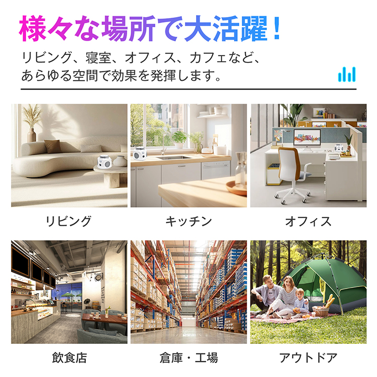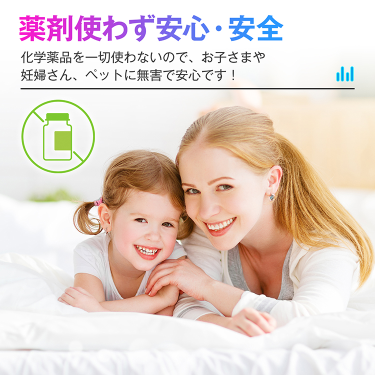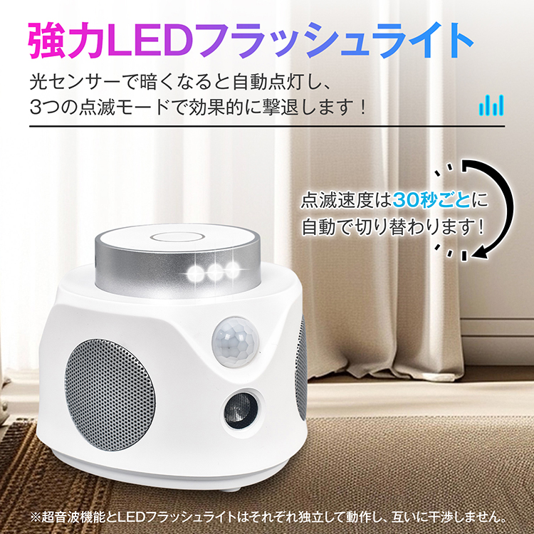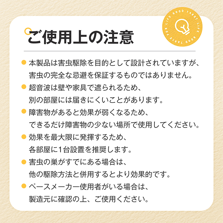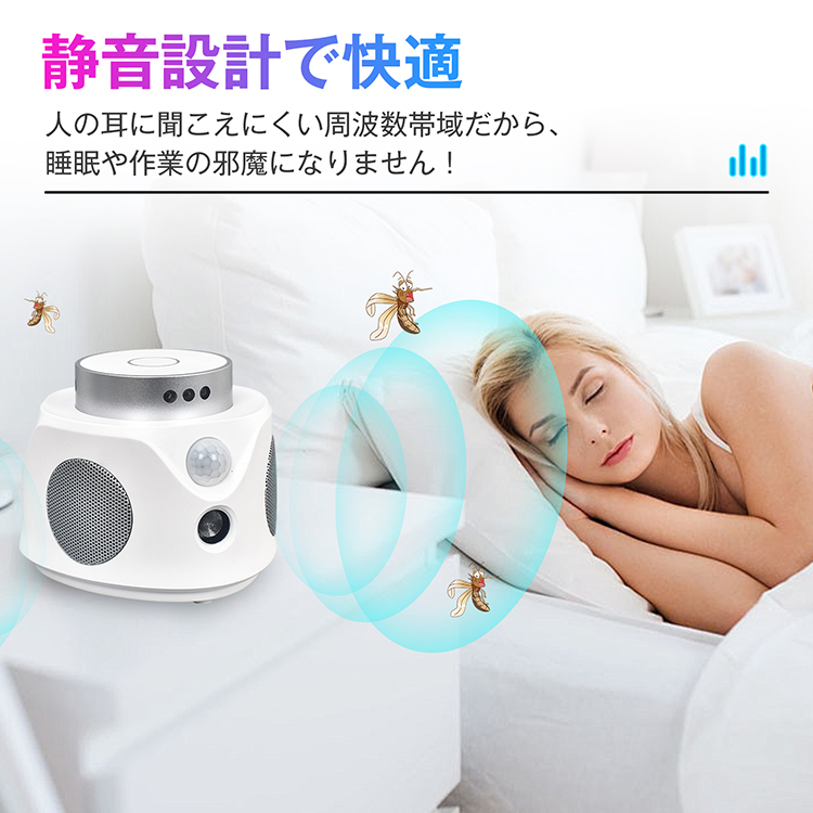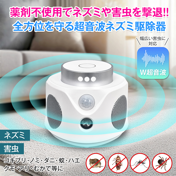 | その他 | ・入力電圧/電流】:DC5V/1A 【超音波周波数】:可変周波数/22-36kHz・固定周波数/25kHz 【消費電力】:1.8W未満 【有効範囲】:(約)最大120平方メートル(72畳) 【材質】:ABS樹脂 |