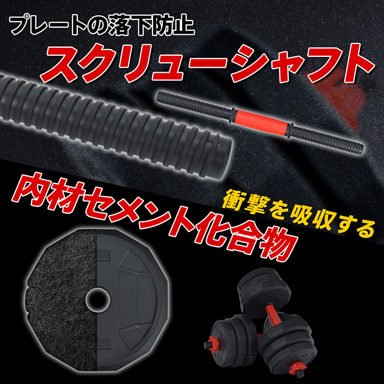 | 種類・サイズ | ・カラー:ブラック、レッド ・スクリューシャフト長さ:(約)44cm ・連結シャフト長さ:(約)40cm ・プレート種類:1.25kg×4/1.5kg×4/2kg×4 |