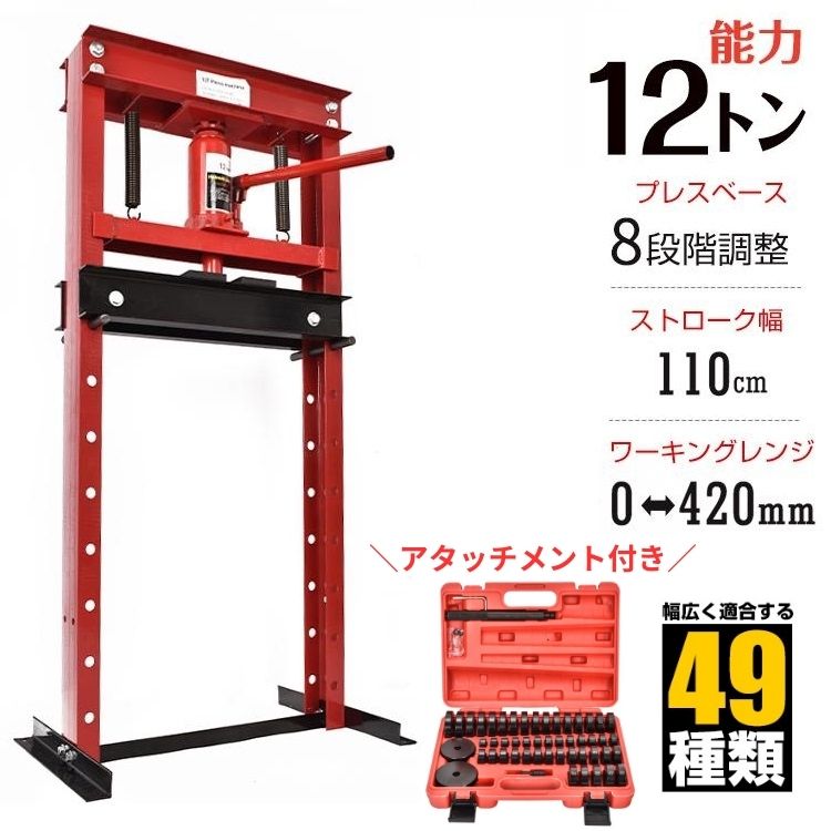 | 種類・サイズ | ●油圧プレス(ee334) 【サイズ】:(約)118cm×60.5cm×40cm 【重量】:(約)35kg 【能力】:12t 【ストローク幅】:(約)110mm 【材質】:鋼 ●油圧プレス用アタッチメント(ee343) 【サイズ】:内径12mm、厚み12.1mm 【外径サイズ】:18mm、19mm、20mm、21mm、22mm、23mm、24mm、25mm、26mm、27mm、28mm、29mm、30mm、31mm、32mm、33mm、34mm、35mm、36mm、37mm、38mm、39mm、40mm、41mm、42mm、43mm、44mm、45mm、46mm、47mm、48mm、49mm、50mm、51mm、52mm、53mm、54mm、55mm、56 mm、57mm、58mm、59mm、60mm、61mm、62mm、63mm、64mm、65mm、74mm 【ケースサイズ】:(約)34.5cm×27.5cm×8cm 【重量】:(約)8kg 【素材】:鉄 |