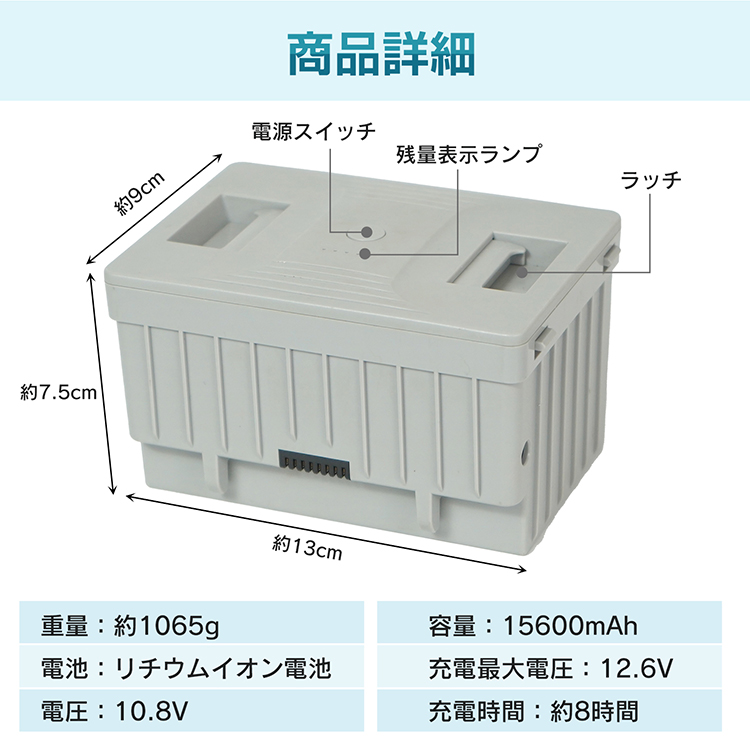 | その他 | ・容量:15600mAh ・電池:リチウムイオン電池 ・電圧:10.8V ・充電最大電圧:12.6V ・充電時間:(約)8時間 |