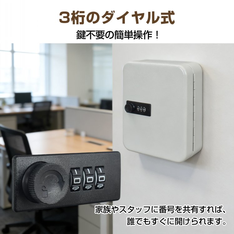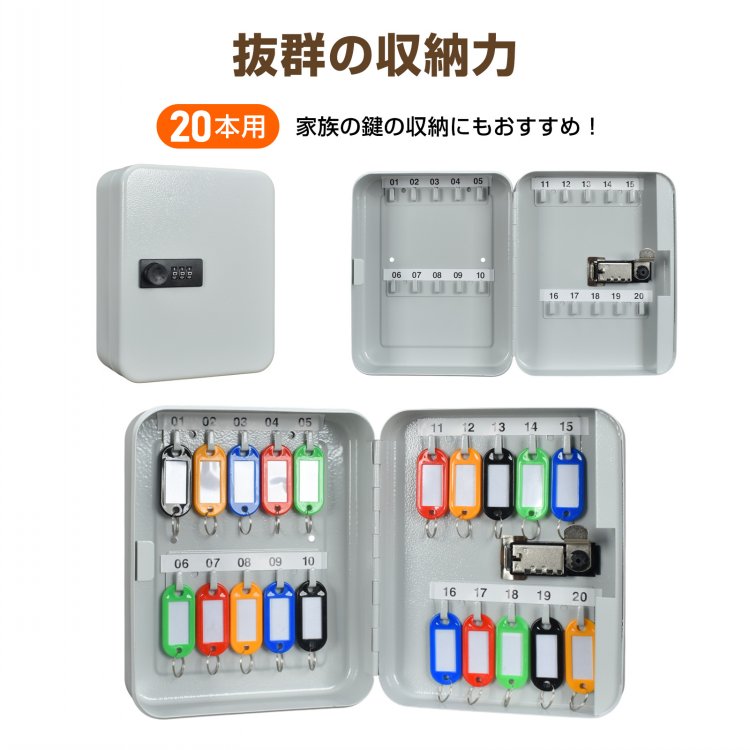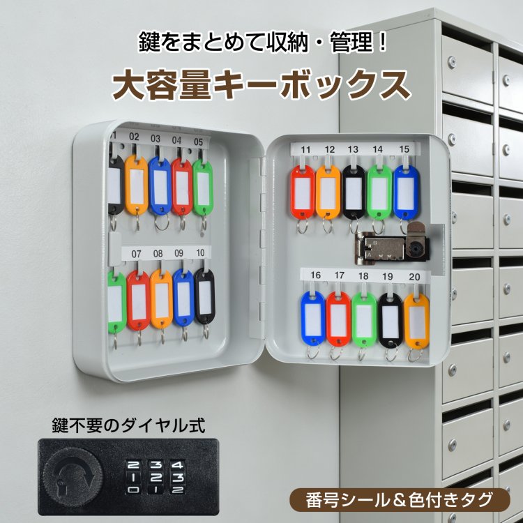 キーボックス 暗証番号式キーボックス キーボックス 大容量 20本 鍵 収納 管理 保管 色付きタグ 色付き 3桁 番号 暗証番号 ダイヤル 鍵不要 壁付け コンク