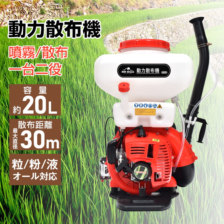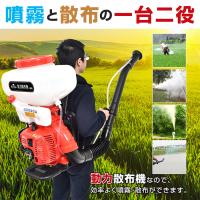 | その他 | ・燃料:混合燃料(25:1) ・エンジン:2ストローク ・排気量:41.5cc ・エンジン出力/回転数:2.13kw/7500rpm ・始動方式:リコイルスターター ・薬剤タンク容量:(約)20L ・燃料タンク容量:(約)1.35L ・最大排出量:(液剤)2.8kg/min (粉剤)13kg/min ・素材:ポリプロピレン |