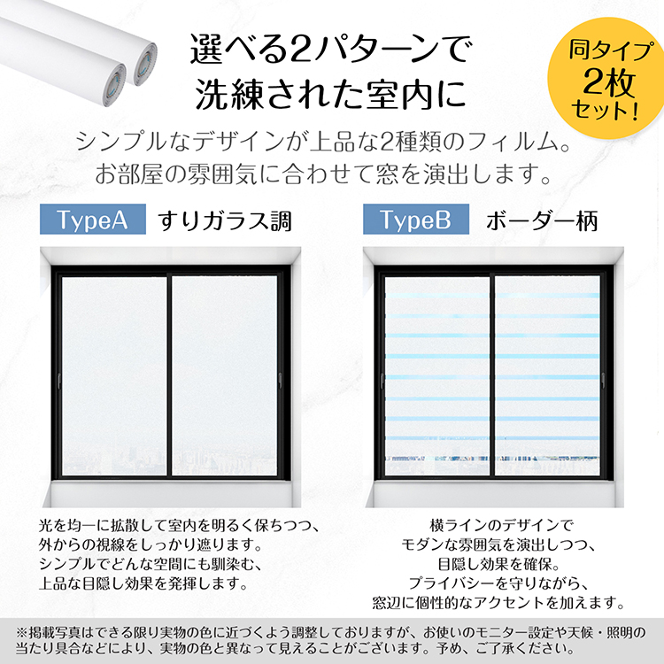 | 種類・サイズ | ・タイプ:すりガラス調/ボーダー調 ・サイズ:(約)45cm×200cm/(約)60cm×200cm |