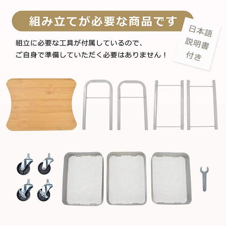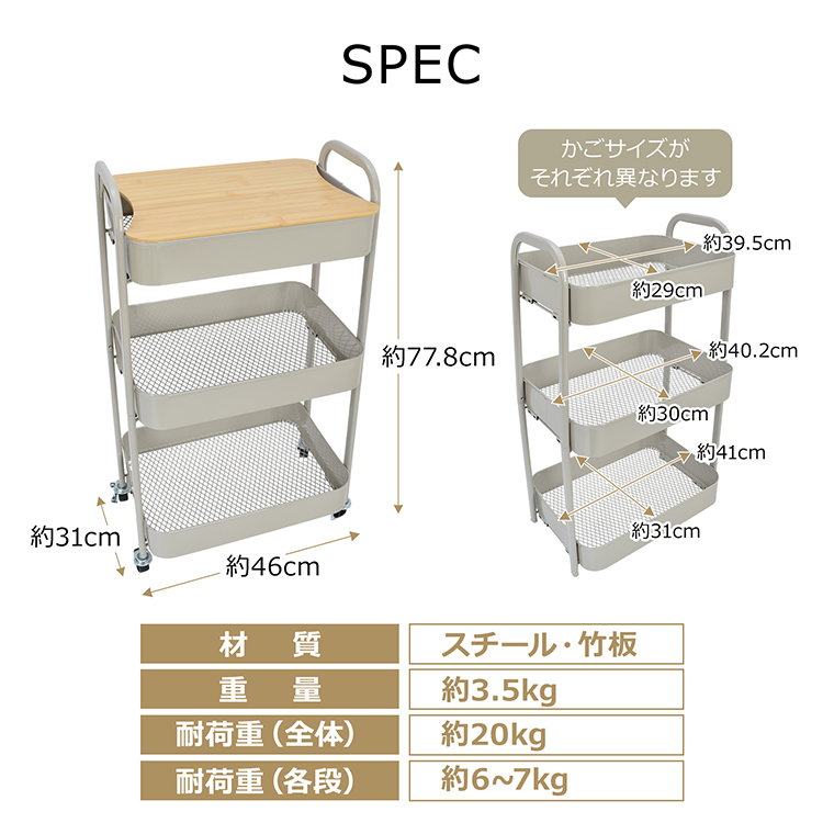 | 重量・耐久 | ・重量:(約)3.5kg ・耐荷重:全体(約)20kg/各段(約)6-7kg |