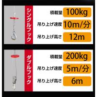 | その他 | ・電源:100V(50/60Hz) ◆シングルフック 最大吊揚荷重:100kg リフト高さ:12m リフト速さ:10m/min ◆ダブルフック 最大吊揚荷重:200kg リフト高さ:6m リフト速さ:5m/min |