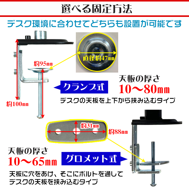 【天板の厚さ】:クランプ式(最大80mm)/ グロメット式(最大65mm)