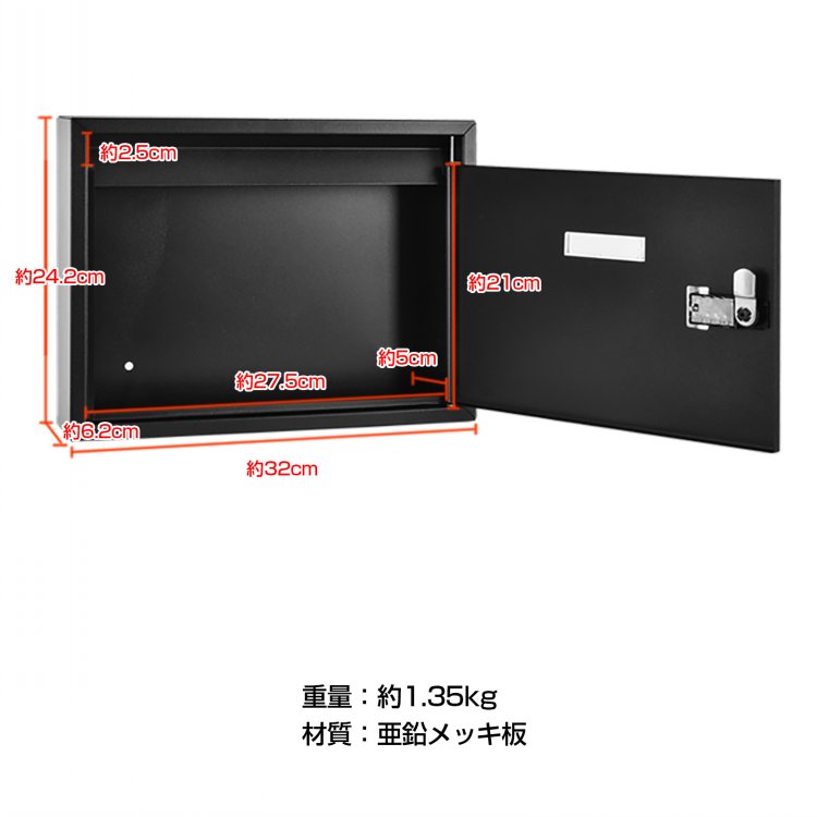 | 種類・サイズ | ●縦型 【商品サイズ(約)】:幅21.5cm×長さ8.5cm×高さ32cm 【投函口サイズ(約)】:幅19.5cm×高さ3.5cm 【内寸サイズ(約)】:幅18.5cm×長さ7.5cm×高さ23.5cm 【重量】:(約)1.27kg 【材質】:亜鉛メッキ鋼板 ●横型 【商品サイズ(約)】:幅32cm×長さ6.2cm×高さ24.2cm 【投函口サイズ(約)】:幅27.5cm×高さ2.5cm 【内寸サイズ(約)】:幅27.5cm×長さ5cm×高さ21cm 【重量】:(約)1.35kg 【材質】:亜鉛メッキ鋼板 |