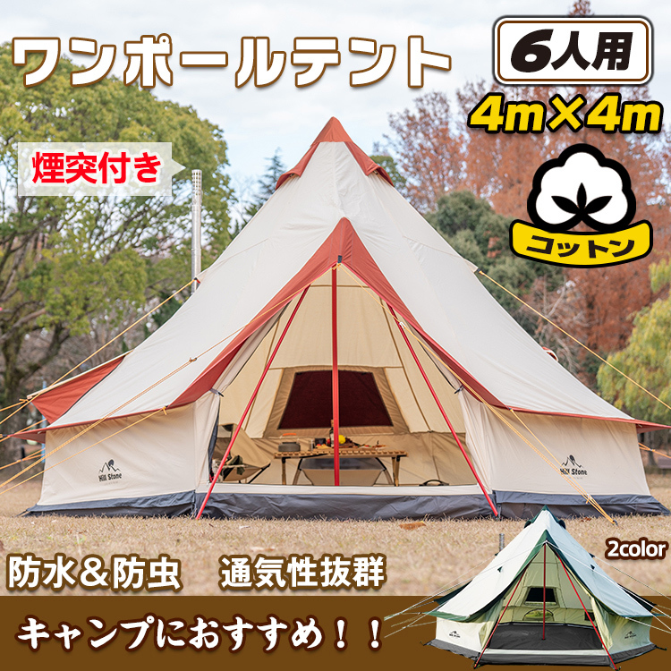 種類・サイズ | ●タイプ:煙突あり/煙突なし ●カラー:グリーン/コーヒー ●サイズ ・テント本体シート:400cm×400 cm×250 cm ・支柱ポール×1:直径3.2cm×250cm ・エントランスポール×2:直径1.6cm×173cm ・ペグ×16:直径1cm×1.8cm ●収納サイズ:(約)80cm×28cm×29cm |