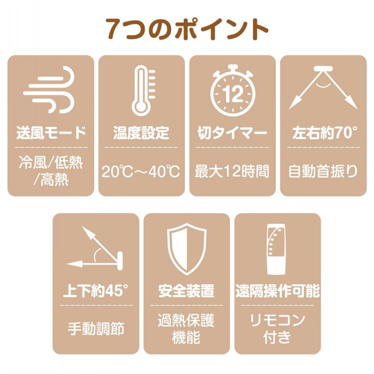 | その他 | ・材質:PP、ABS、ナイロン ・電源コード:(約)130cm ・定格電圧:AC100V ・定格周波数:50/60Hz ・定格消費電力:冷風モード35w/低熱モード600w/高熱モード1200w ・リモコン用電池:単4電池×2本(別売) |