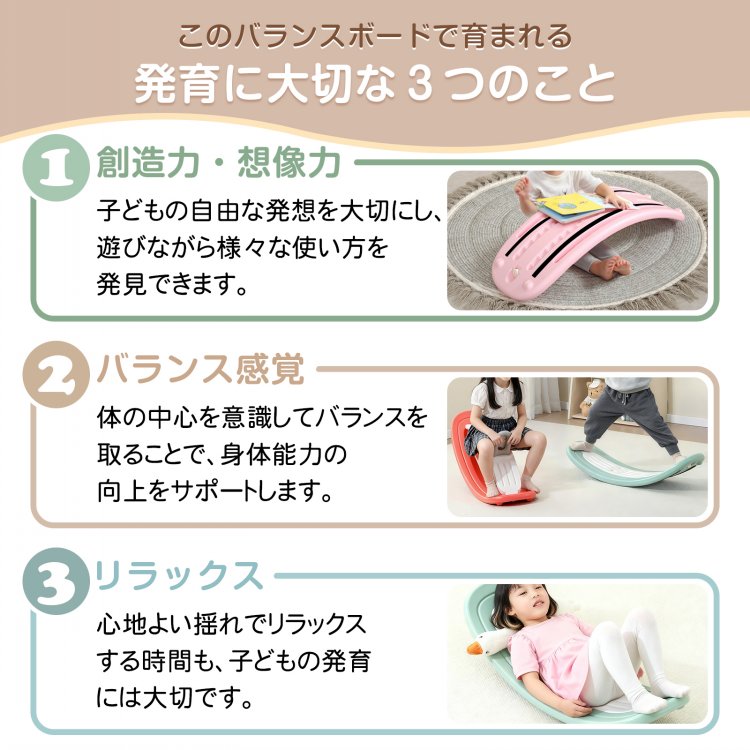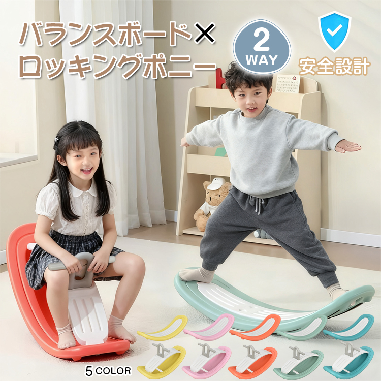 | 種類・サイズ | ・カラー:ピンク・イエロー・オレンジ・ターコイズグリーン・ライトグリーン ・サイズ:(約)バランスボード85×30×20cm/ロッキングポニー85×30×41.5cm ・ボード厚さ:(約)3.5cm |