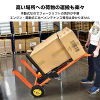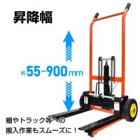 | 種類・サイズ | 【本体サイズ(約)】:全長830mm×幅710mm×高さ1255mm 【昇降幅(約)】:55mm〜900mm 【フォーク調整幅(約)】:150mm〜510mm |