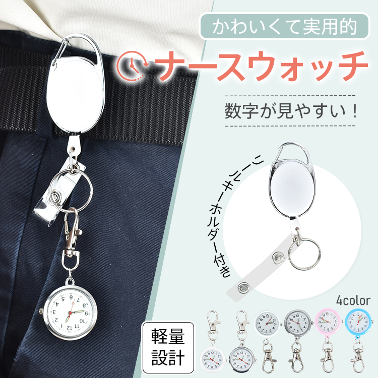 | 種類・サイズ | ・カラー:ホワイト、シルバー、ピンク、ブルー (通常文字盤はホワイト、シルバーのみ) ・ナースウォッチサイズ:(約)3cm×7cm ・リールキーホルダーサイズ:(約)3cm×9.5cm~74.5cm |