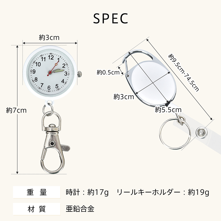 | 重量・耐久 | ・ナースウォッチ重量:(約)17g ・リールキーホルダー重量:(約)19g |