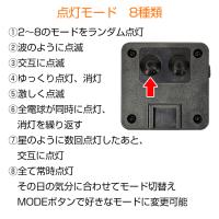 | その他 | ・LEDライト数:300球 ・点灯モード:8種類 ・LEDライトの間隔:(約)10cm ・電池:ニッケル水素電池 1.2V 600mah ・フル充電時間:(約)8〜12時間 ※天候などの環境によって変動 |