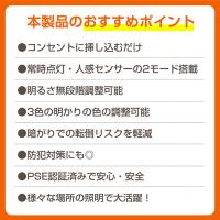 | その他 | ・材質:ABS ・電圧:100V 50/60Hz ・消費電力:0.2〜2.5W ・LED数:60個 ・LED寿命:50000時間 ・色温度:2800〜6000W ・感知距離:(約)5m ・感知角度:(約)120° ・三段階調整色:電球色/昼白色/昼光色 |