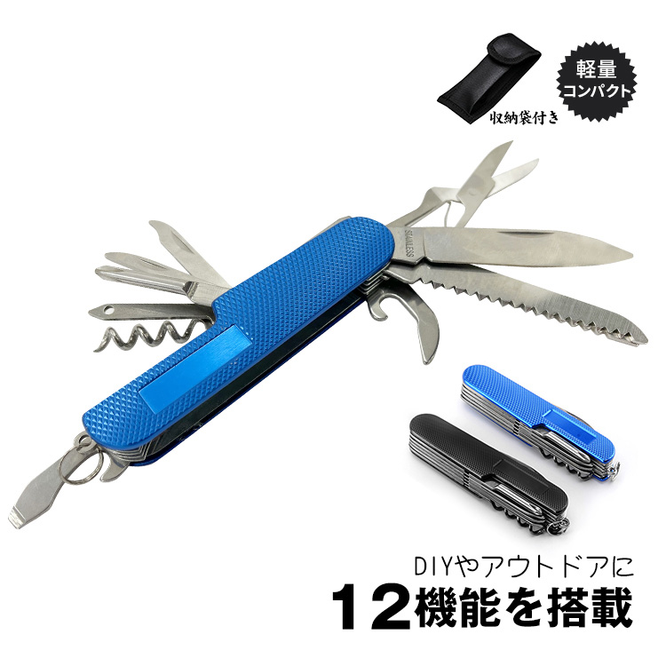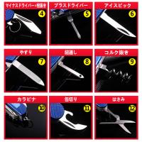 | その他 | ・機能:ナイフ/のこぎり/鱗落とし+釘抜き/マイナスドライバー+栓抜き/プラスドライバー/アイスピック/やすり/紐通し/コルク抜き/カラビナ/缶切り/はさみ |