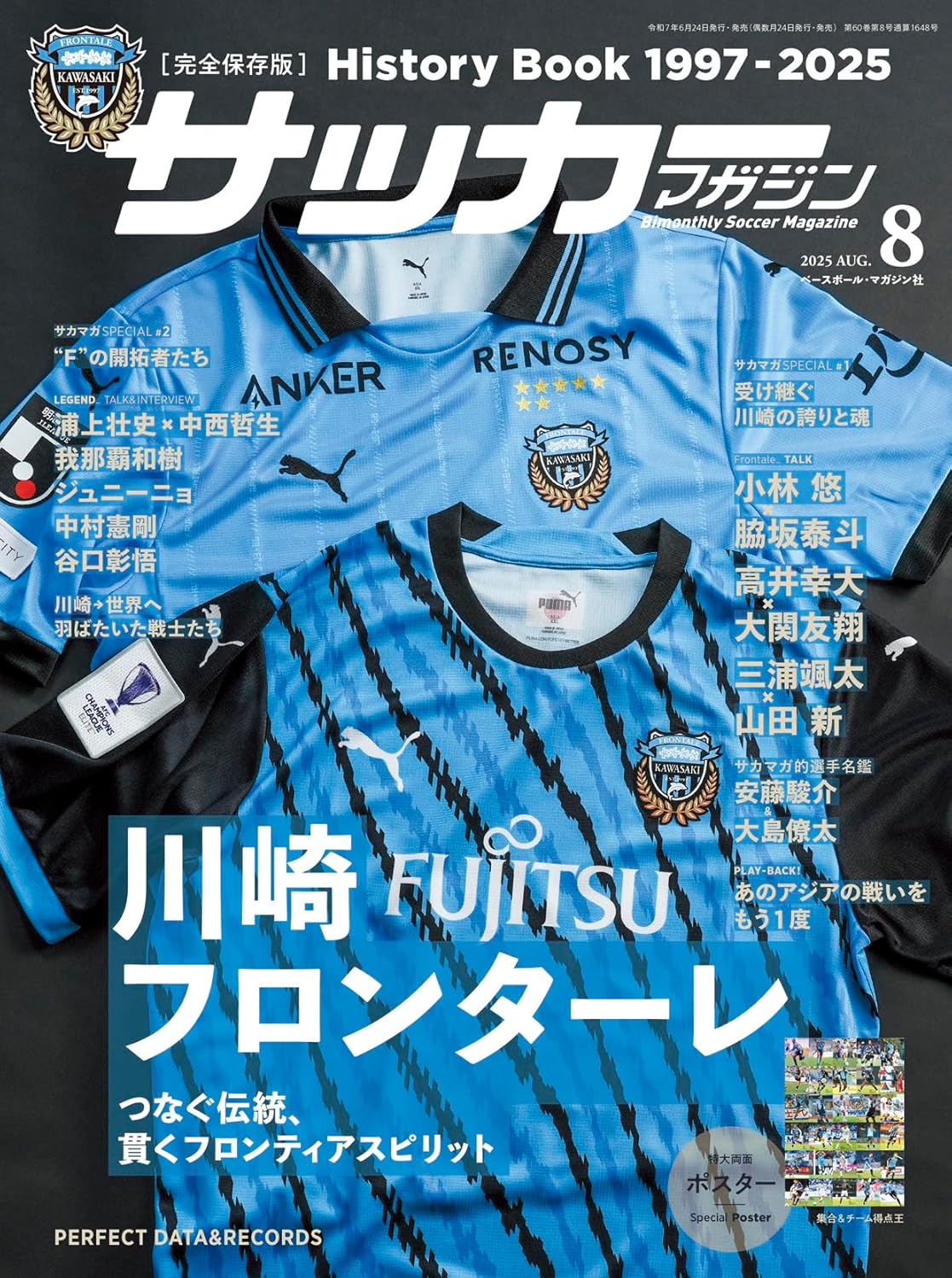 サカマガSpecial.2“F”の軌跡_愛の街で育まれた29年■“F”の開拓者たち□LEGEND TALK1 浦上壮史×中西哲生:創成期支え、未来を切り開いた“プロフェッショナル”□LEGEND SINTERVIEW2我那覇和樹:沖縄生まれ、川崎育ち。たたき上げストライカー□LEGEND INTERVIEW3ジュニーニョ:愛に包まれた川崎の“太陽”□LEGEND INTERVIEW4中村憲剛:最強フロンターレができるまで□LEGEND INTERVIEW5谷口彰悟:勝利を知る最終ラインの“統率者”■HISTORY OF FRONTALE_1997〜2025■時代を駆けたF戦士_1997〜2025■完全保存版1997〜2025在籍全選手&監督名鑑■川崎フロンターレPERFECT RECORD 1997〜2025ほか