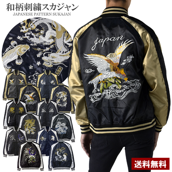 スカジャン メンズ アウター ブルゾン サテン 須賀 ジャンパー ジャケット ゆったりサイズ 鷲 鯉 龍 波 鳳凰 銀龍 風神 雷神 虎 セール A5T 爆買