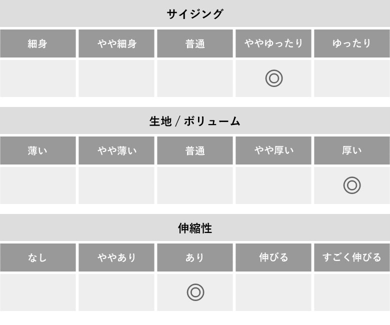 体型と見映えのバランスに考慮した、ゆったりサイズスペックで仕上げられております。
