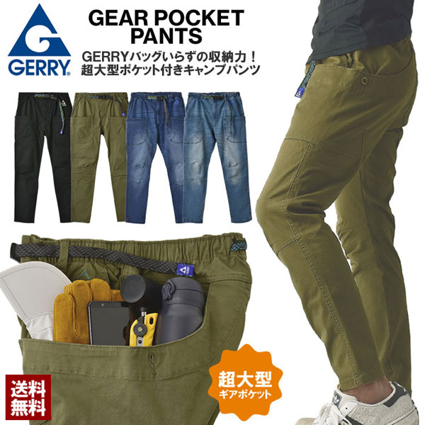 ※本品はゆうパケット便発送(ポスト投函)にて送料無料中です。 本品を含め複数点のご注文を下さった場合には宅配便にて発送致します。※ゆうパケット便発送の場合、ポスト投函サイズに合わせる為、 真空パックで梱包する事がございます。ブランド「GERRY・ジェリー」のキャンプパンツです。ストレッチの効いた綿素材で、動きやすいアクティブなパンツ。ウエストもギャザーで伸縮し、ウェービングベルト付♪最大の特徴は、フロントからヒップにかけての超大型ギアポケット。手やバッグを使わずに様々な物を持ち運ぶことができます。両サイドのギアポケット以外にも、フロントポケット×2、ヒップポケット×1とバッグいらずの大容量。DIYやキャンプはもちろん、タウンユースにもオススメのアイテムです。