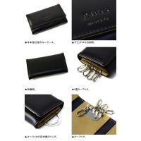 ・表素材に牛革、中素材に合皮を使用。 ・スナップボタンで開閉できる3つ折りタイプ。 ・4つのキーフックと1つの大径リングを装備。 ・カードキーが入るミニスペース付き。