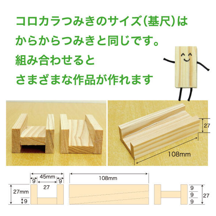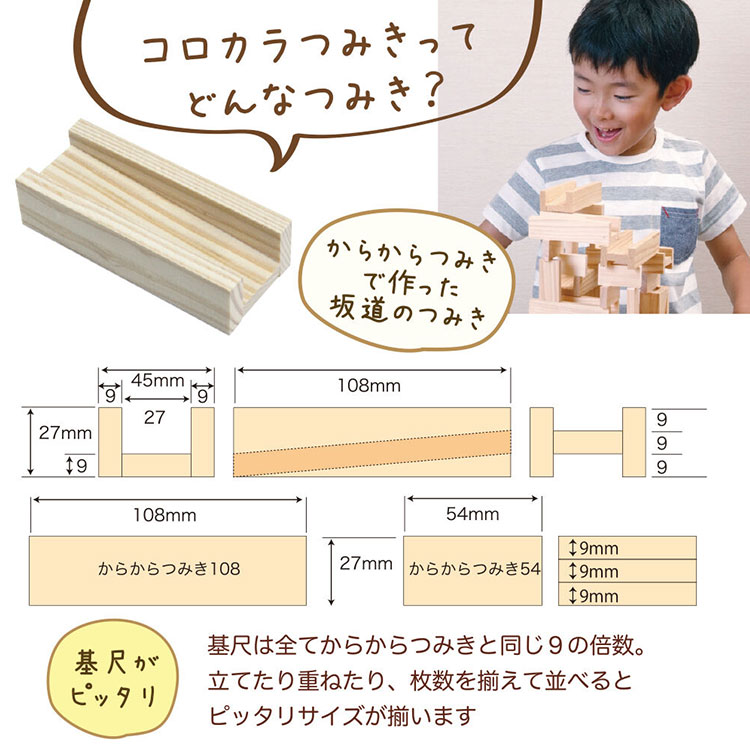 | サイズ | ◇ コロカラつみき単品サイズ:45×27×108mm ◇ からからつみき54単品サイズ:9×27×54mm ◇ 箱のサイズ:280×195×148mm |