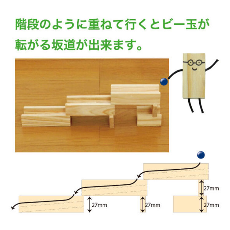 | ※すでにからからつみきをお持ちの方、追加で購入の方におすすめです。(土台のからからつみきは入っていません) ・コロカラつみきは、からからつみきで作った小さな坂道のつみきです。高さを合わせて並べるとスムーズに転がる坂道になります。また、つみきのように簡単に積み上げビー玉が転がる坂道を考えながら作ります。 ・コロカラつみきは、自然乾燥したからからつみきから出来ています。自然木のため、乾燥が進み割れることがあります。また踏みつけたり投げたりするとこわれることがあります。 ・ビー玉を飲み込むと窒息する恐れがあります。決して口に入れないで下さい。また、3歳以下の小さなお子さまの手の届かない場所で保管してください。 ・こわれたコロカラつみきは使用しないで下さい。ケガをする恐れがあります。長期間、湿度の多い場所に保管した場合はカビが発生する恐れがあります。 ・コロカラつみきは、杉の木から出来ているため、水分を吸収しやすくなっています。水にぬれた場合、すぐに拭き取り自然乾燥させてください。 ・永く使っていただくと徐々に自然な飴色に変色しますが、スギの特徴ですので安心してご使用下さい。 |