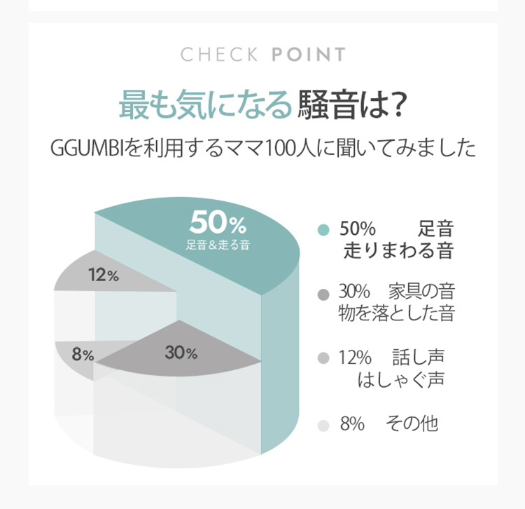 | お子様が家の中で走り回る音、階下への騒音が気になる…そんなお悩みを抱えるママさんに朗報です! GGUMBI(グンビ)の防音スリッパは、まるでフロアマットを敷いているかのような静けさを実現。 特許出願済みの技術で、快適な「おうち時間」をサポートします。 【こんなお悩みありませんか?】 ・お子様の足音が階下に響いていないか心配… ・マンション暮らしで騒音トラブルが不安… ・フローリングの部屋で、マットを敷けない場所がある… ・家の中でもっと気軽に過ごしたい! GGUMBIが行ったアンケートでは、ママたちの騒音に関する悩みで最も多かったのが「足音・走り回る音」でした(50%)。 そんなママたちの声に応えるために開発されました。 |