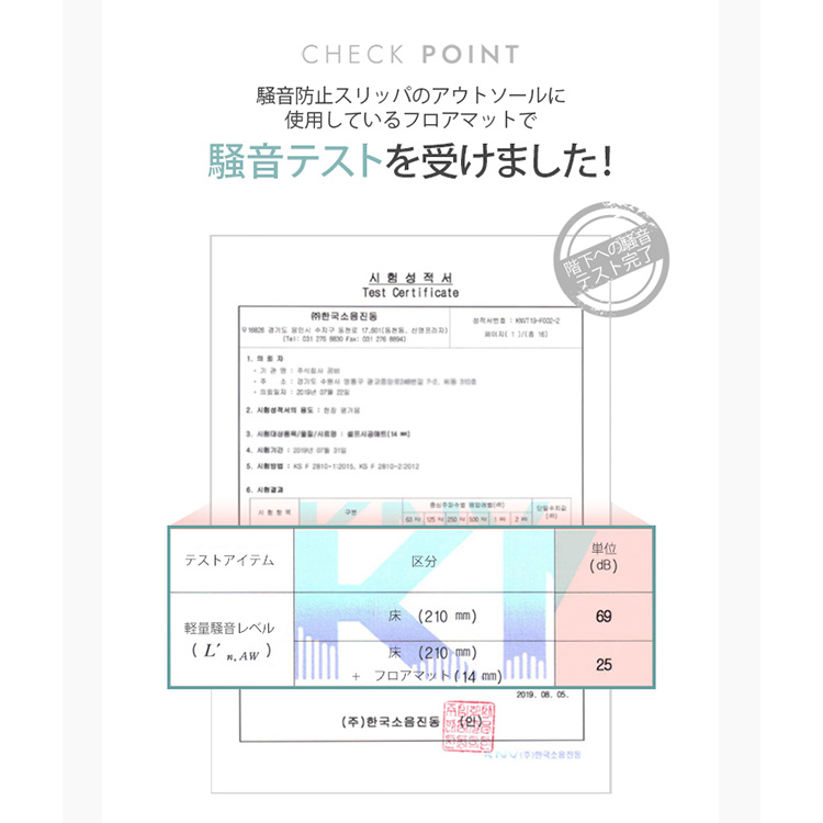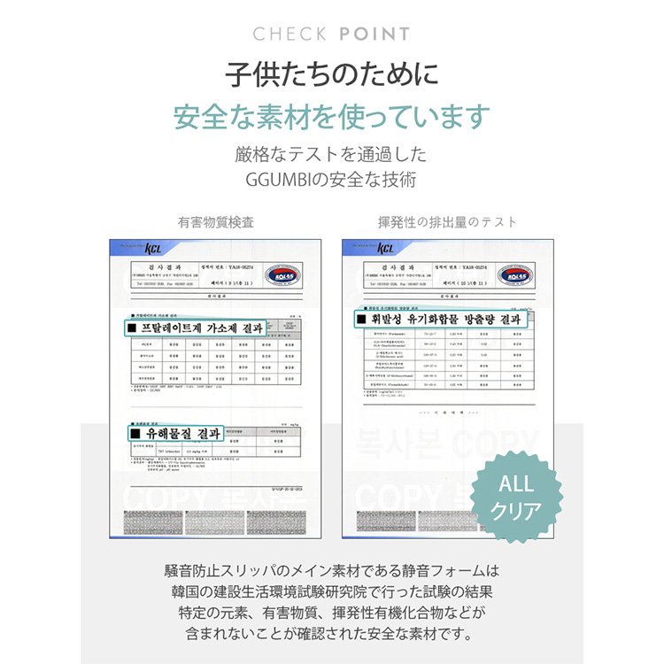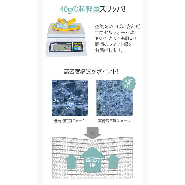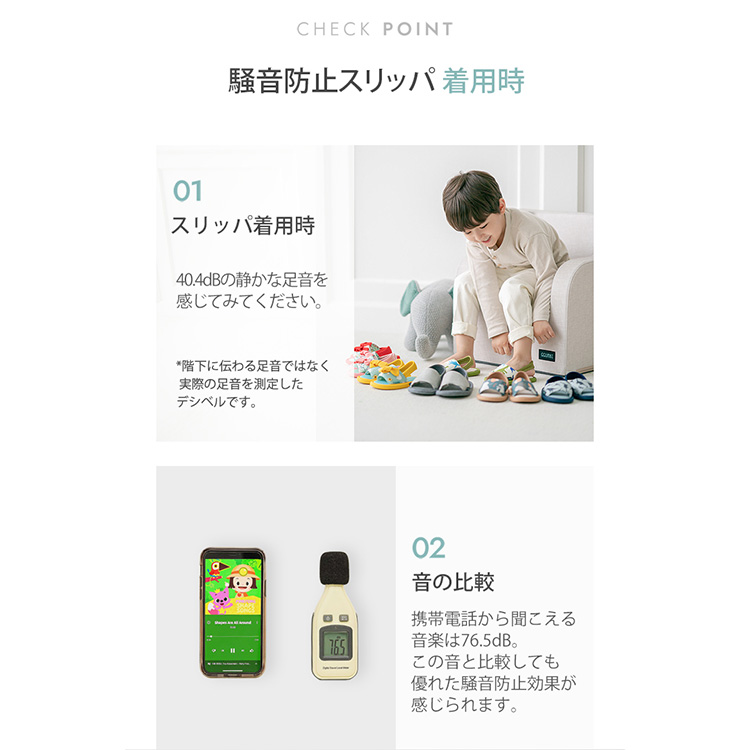 | 驚きの防音効果! ・階下に響く足音を「ささやき声レベル」の25dBまで低減! ・国際公認試験機関で認証された防音効果(無対策時69dB → スリッパ着用時25dB)。 プレイルームマットと同じPE素材を使用 ・衝撃吸収性に優れ、子供の走り回る音や物を落とした音も軽減。 ・3層構造(PUフォーム・PEフォーム・PVCフォーム)で長時間のクッション性を確保。 安全設計 ・有害物質・揮発性有機化合物を含まない安全素材を使用。 ・滑りにくいノンスリップ加工(45°傾斜でも安定)。 超軽量・快適履き心地 ・1足わずか40g! 軽くてフィット感抜群。 ・脱げにくいバックストラップ付き |