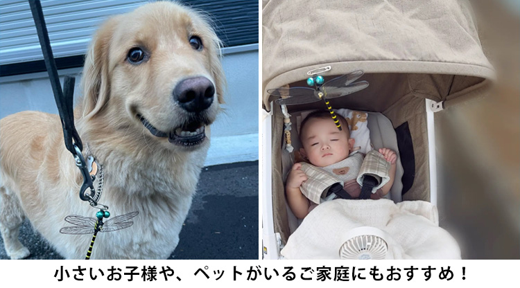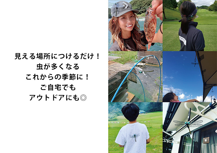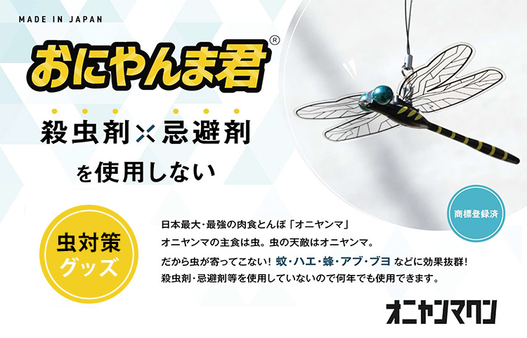 | 日本最大・最強の肉食トンボ「オニヤンマ」。 オニヤンマの主食は虫ですので、虫たちにとって天敵です。 本物そっくりなおにやんま君を見えるところに付けておくで、蚊やハエ、蜂、アブ、ブヨなどが逃げていく効果を期待できます。 薬剤は一切使用しておりませんので、小さいお子様や、ペットがいるご家庭にもおすすめ。 |