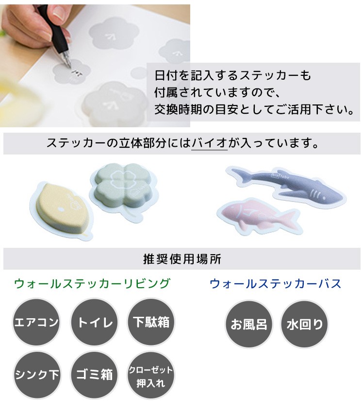 | ステッカーを貼るだけでカビが生えにくくなります。 立体ステッカーの中に住まわせたバイオが、カビを抑制する特殊な抗菌性の揮発性物質を発することで、このステッカーを貼る場所周辺にカビが生えにくくなります。また、このバイオが発する揮発性物質は消臭効果もありますので、臭いの発生源となる場所に貼って頂くと効果的です。 ■推奨使用場所 ・リビング エアコン:エアコン本体の空気吸い込み口付近に貼り付けてご使用下さい。 トイレ:トイレ内の壁面上部に貼り付けてご使用下さい。 下駄箱:下駄箱内の壁面上部に貼ってご使用下さい。中の物と干渉しない場所をお選び下さい。 シンク下:室内の壁面上部に貼ってご使用下さい。中の物と干渉しない場所をお選び下さい。 ゴミ箱:フタの内側に貼ってご使用下さい。中の物と干渉しない場所をお選び下さい。 クローゼット・押入れ:室内の壁面上部に貼ってご使用下さい。中の物と干渉しない場所をお選び下さい。 ・バス 風呂:浴室でご使用の場合、なるべく天井に近い浴室の壁面上部に貼り付けください。 水回り:脱衣所などでご使用の場合、水が掛からない場所を選び、なるべく上部に貼り付けてください。 |