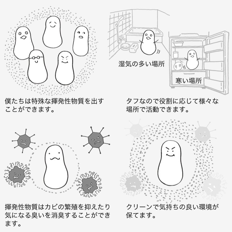 | バイオラボのバイオは、特殊な抗菌性の揮発性物質を出すことができます。その揮発性物質にはカビの繁殖を抑えたり、気になる臭いを消臭する力があります。 このバイオは、生命活動が困難な状況下では自ら殻を作った芽胞(休眠)状態なりますが、その状態でも有効な揮発性物質を発するのが特徴です。 リビングシリーズでは冷蔵庫やエアコンの冷気が当たる場所のような低温でも耐え得るバイオを、バスシリーズではお風呂場のような高温多湿の環境下でも耐え得るバイオを選ぶなど、使用シーンごとにバイオを使い分けています。 |