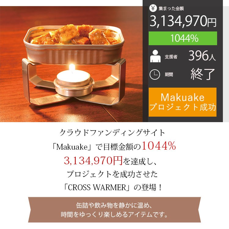 | 缶詰や飲み物を静かに温める“CROSS WARMER” CROSS WARMERは缶詰や飲み物を静かに温め、時間をゆっくり楽しめるアイテムです。 いつも通りの日常とはちょっと違う過ごし方、してみませんか。 |
