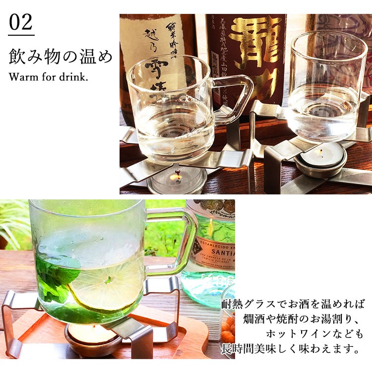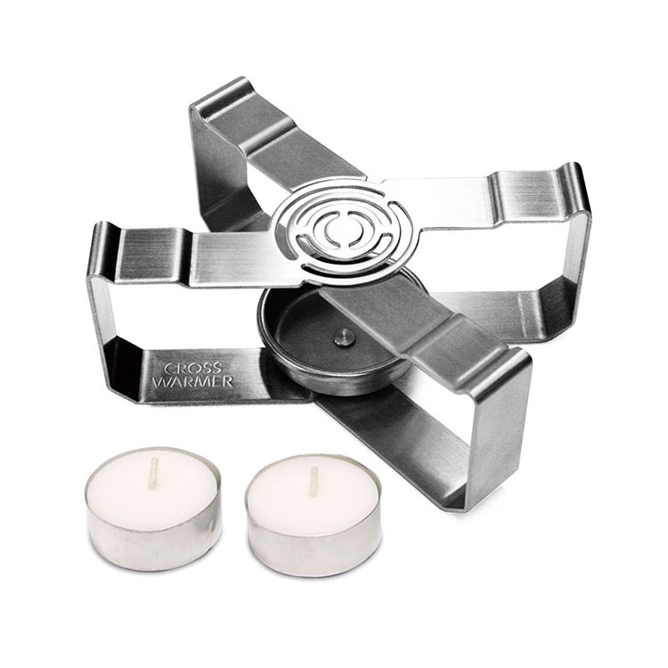| 【使用燃料】 アルミカップ入りキャンドル(キャンドル径38mm 高さ18mm程度) 【使用方法】 お好みの缶づめを開蓋後この「CROSS WARMER」を使用して 温めた状態でお召し上がりが可能です。 ※キャンドルの燃焼時間は約5時間程度です。 ※キャンドルは径38mm、高さ18mm程度のものをご使用ください。 ※キャンドルは火力の安定したカメヤマ株式会社製ティーライトティン(アルミカップ入り)をおすすめします。 【Q&A】 Q.キャンドルは100円ショップで売っているものでも使えますか? A.標準的なサイズ(径38mm、高さ18mm程度)のキャンドルならば、使用可能です。ただ品質が良くないキャンドルですと、ロウの品質や芯の位置にバラツキがあるため、安定した火力にならない場合があります。当社としてはカメヤマキャンドルのティーライトティンをオススメしています。 Q.注意事項はありますか? A.空焚きはしないでください。白い煙があがり危険です。缶詰を食べ終わったら、必ず火を消してください。 Q.どれぐらいの重さにまで耐えられますか? A.缶詰や耐熱グラスを乗せる事を想定して設計していますが、小型の鍋などは大丈夫です。 |