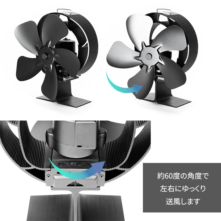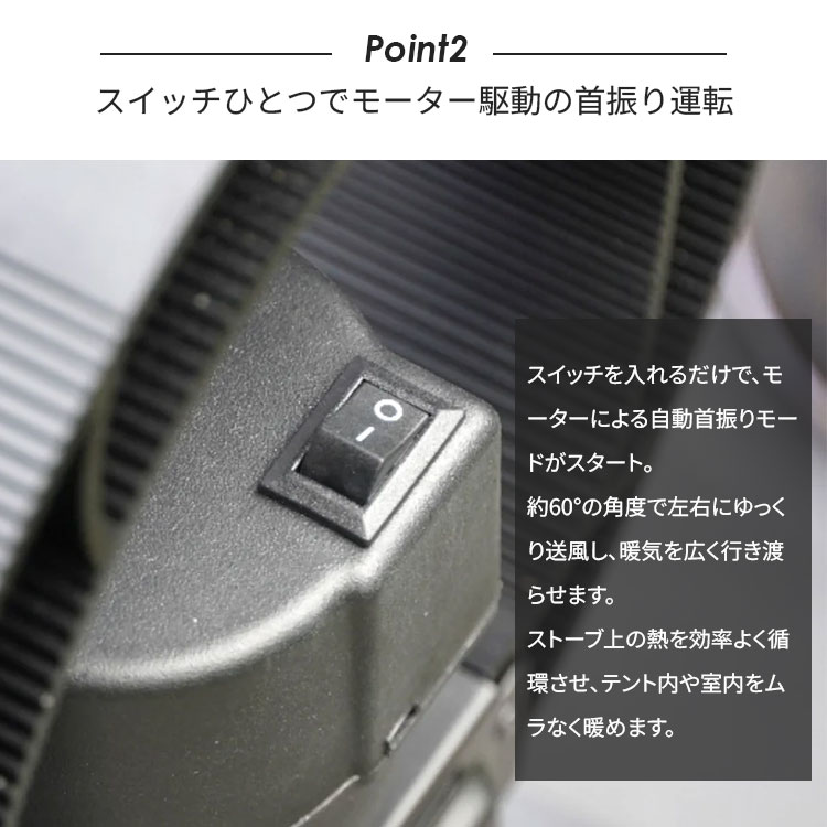 | 「ただ熱を上に逃がすだけ」なんてもったいない!このファンは、スイッチひとつでモーター駆動の首振り運転が可能です。 広範囲に送風:約60°の角度で左右にゆっくりと動き、暖気を広く拡散します。 ムラなく快適:ストーブの上の熱を効率よくテント内や室内全体に循環させ、温度ムラを解消します。 暖房効率アップ:熱を下に押し出すことで、体感温度が上がりやすくなります。 |