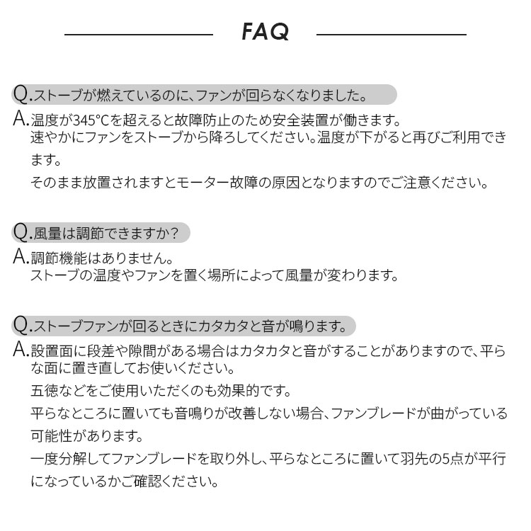 | ・ご使用中のファンのベースは高温になりますので決して触らないでください。 ・ファンを移動または持ち運ぶには、耐熱性グローブを着用して上部のハンドルをご使用ください。 ・ご使用中は小さなお子さまの手の届かないところでご使用ください。 ・ストーブファンの安全なご使用には、ストーブ温度計を一緒にお使いください。 ・一部の石油ストーブでは、上昇気流の影響により接地面温度が低くても内部が高温になる場合があります。 過熱判定シールが赤く変色した場合は保証の対象外となります。ご使用時はサーモカラーシールを確認し、過熱にご注意ください。 ※商品の色はモニターの具合で実物と若干異なる場合がございます。予めご了承下さい。 ※ご予約・お取り寄せ商品は、ご注文受付後にお客様ご注文分としてメーカーへ発注を致します為、基本的にキャンセルやご返品はお受けできません。 ※デザイン、仕様等につきましては、予告なく変更する場合がございます。予めご了承下さい。 ※複数店舗を運営しておりますため、ご注文の入れ違い等で欠品などになってしまう場合がございます。万が一、発送が遅れる場合は、ご注文受付当日中にご案内差し上げます。誠に恐れ入りますがご了承くださいますよう、お願い申し上げます。 | |