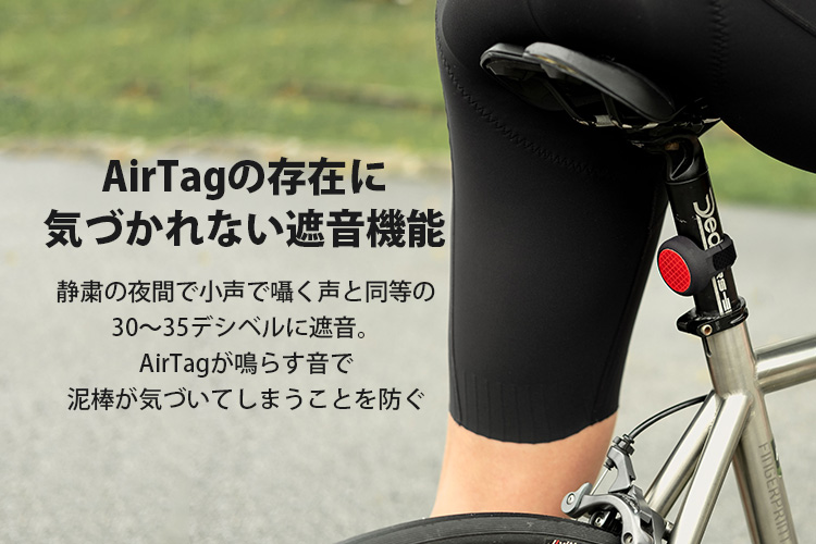 | AirTagが鳴らす音で泥棒がAirTagに気づいてしまうことを防ぐため、TRACEには遮音機能が備わっています。内蔵の遮音パッドがAirTagの音を消音します。AirTagの保護を強化するための2つ目のアプローチです。プロトタイプのTRACE内のAirTagと単独のAirTagを比較しながら消音テストを繰り返しました。遮音パッドによってTRACE内のAirTagの音は30〜35デシベルを測定しました。静粛の夜間で小声で囁く声と同等です。路上ではほとんど聞こえません。 |