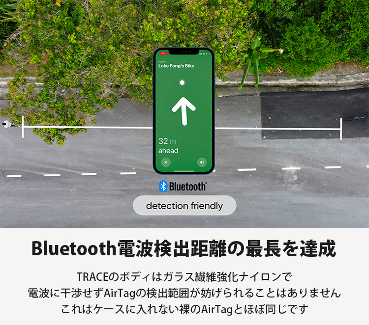 | ガラス繊維強化ナイロンは、耐候性、耐久性、軽量性に優れ、様々な先端部品に使われています。ABSやPC素材に比べて非常に丈夫で、屋外での厳しい環境に最適な素材です。自転車とともに屋外にさらされるTRACEの素材に最も適しています。天候の影響で劣化することがなく、内部のAirTagへ与える影響は全く心配ありません。 |