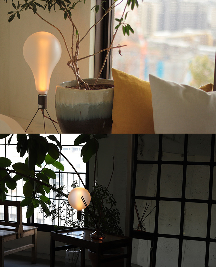 | 明るさを抑えたLED電球「ノスタルジア」シリーズ 氷砂糖のような透け感のあるフロストタイプのガラスから柔らかく透けた明かりは、落ち着きのある空間を演出します。 白熱電球のような暖色の温もりのあるレトロな電球色です。 照らすための電球ではなく、飾るための電球にこだわり明るさを抑えた暗めの電球です。 直接眺めても眩しくないので、寝室のベッドサイドランプや常夜灯、リラックスしたい空間の間接照明にもおすすめです。 |