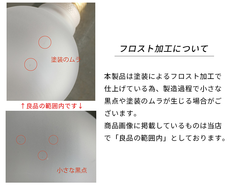 | ・位相制御式、国内のLED専用調光器をご使用ください。(PWM/DMX式、デジタル制御式、そのほか一部の調光器には対応しておりません。) またご使用の環境、調光器具との相性などによって調光しない場合があります。 ・0−100でのスムーズで完全な調光を約束するものではありません。 ・調光器の種類や使用負荷数によってはノイズやちらつきが発生することがあります。 ※LED電球は照明器具や調光器、電気経路との相性がございますので、業務用として大量に本製品を使用される場合等、お使いの環境に適用されるか一度ご確認ください。 【フロスト加工について】 本製品は塗装によるフロスト加工で仕上げている為、製造過程で小さな黒点や塗装のムラが生じる場合がございます。 |
